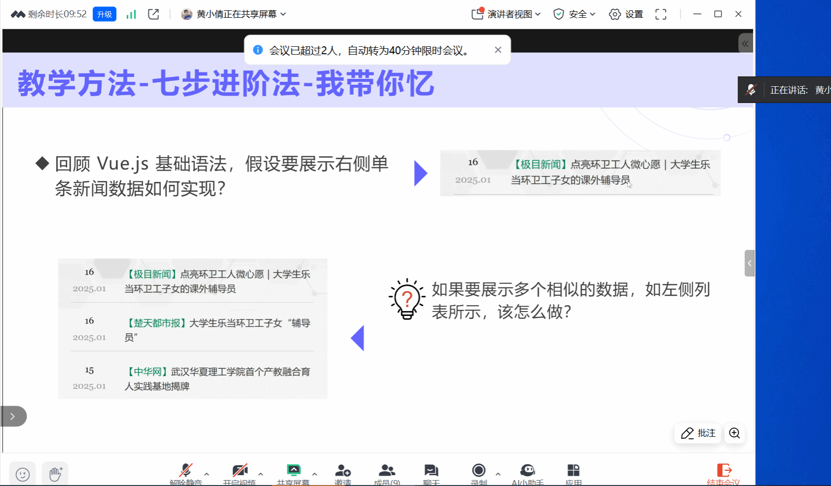 紧接着,黄小倩老师运用七步进阶法讲解 Vue.js 列表渲染指令,为复杂知识点的教学提供了新的思路。邱珊老师则聚焦 CSS 选择器,通过丰富的示例和详细的讲解,加深了大家对这一关键知识点的理解。汪汝老师介绍了 canvas 组件的属性和使用方法,采用先 20 分钟知识点讲解,再布置任务让学生实践练习的教学模式,注重理论与实践的结合。