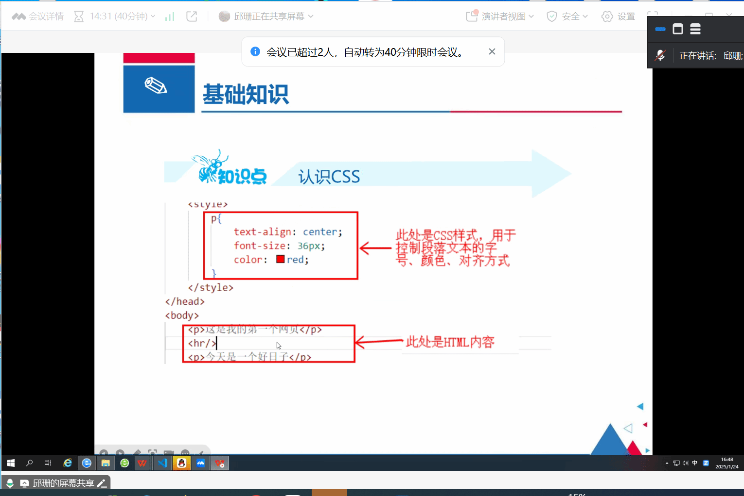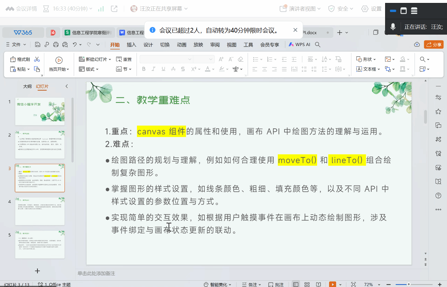 为进一步提升 Web 前端开发课程的教学质量,优化教学内容与方法,2025 年 1 月 24 日,计算机系 Web 前端开发课程组借助腾讯会议平台,成功开展了一场深入的磨课活动。此次活动汇聚了课程组的核心力量,旨在通过交流与研讨,为学生带来更优质、高效的课堂体验。