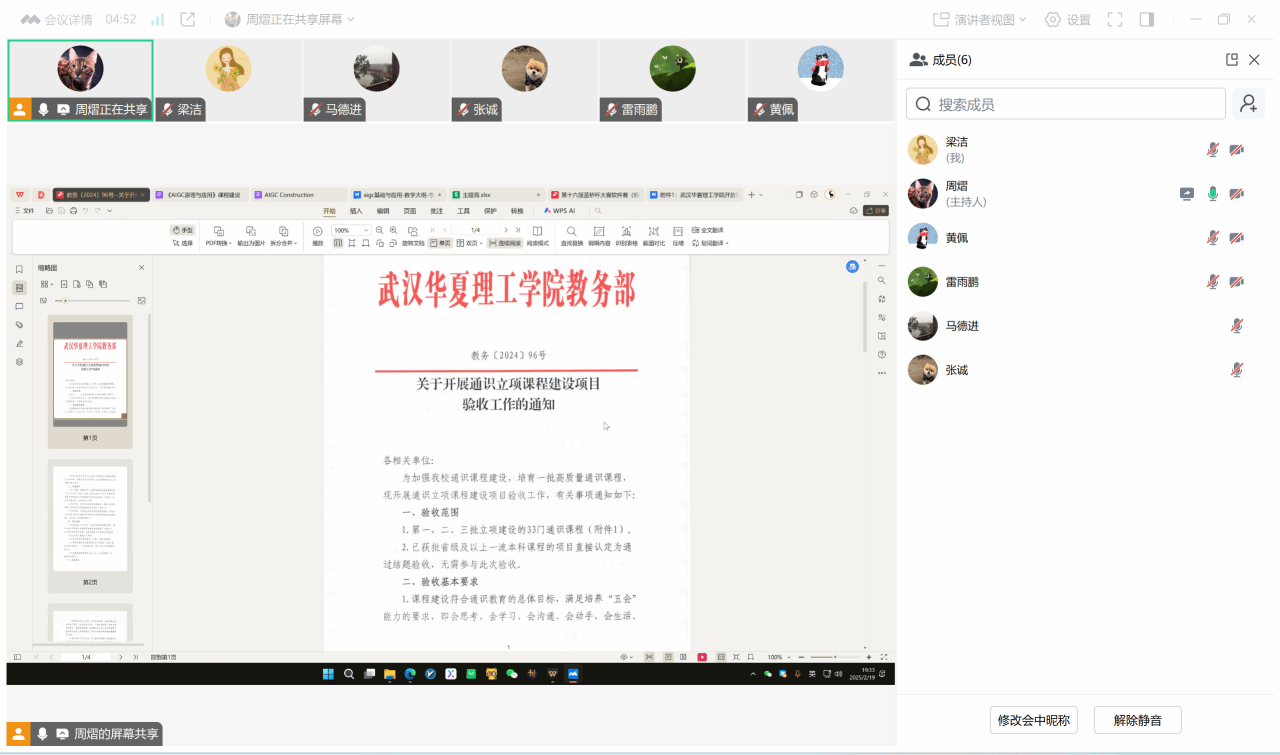 在数字化浪潮席卷全球的当下,AIGC(人工智能生成内容)技术正以前所未有的速度重塑着各个领域。为了更好地将前沿科技融入教育体系,提升全校师生的综合素养,于2025年2月19日成功开展了 AIGC 第一次课研活动线上会议。此次会议由我院周熠主持,梁洁、黄佩、雷雨鹏、张诚、马德进等老师参加,共同为 AIGC 基础与应用课程的完善集思广益、出谋划策。