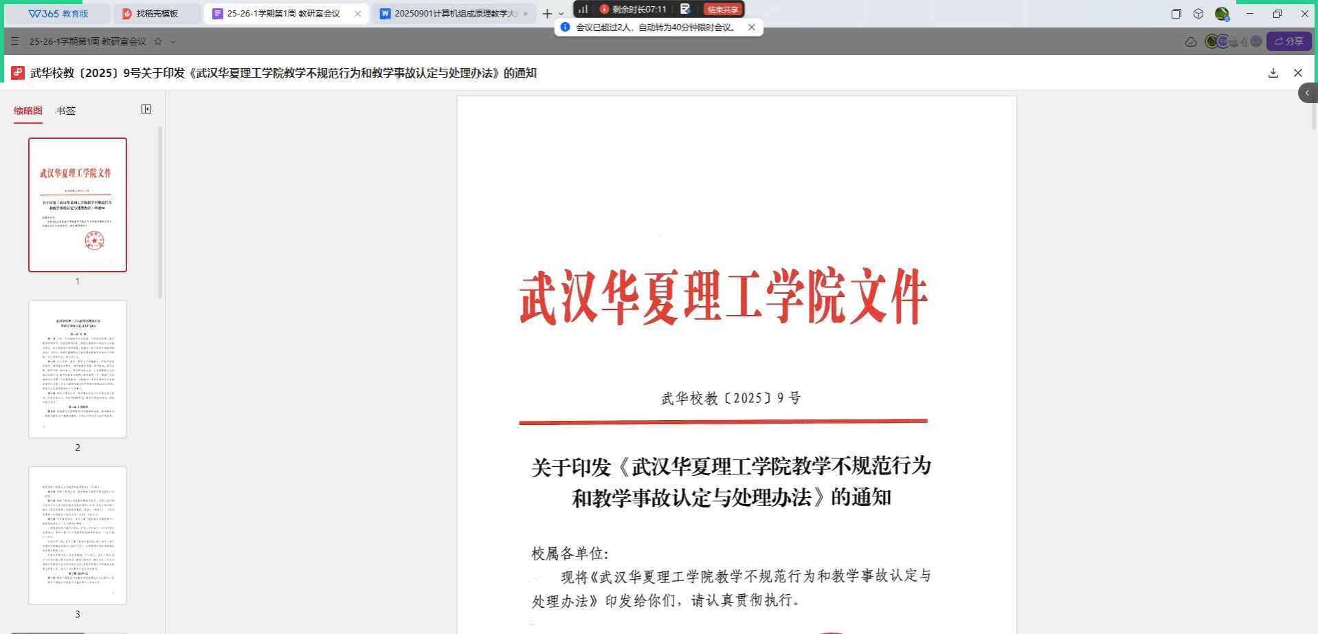 为切实规范日常教学行为,明晰教学过程中的责任边界,全面提升人才培养质量,9月1日,计算机科学与技术教研室组织全体教师开展专题学习会,重点学习《beat365官方网站教学不规范行为和教学事故认定与处理办法》。本次学习会由教研室苏明霞老师主持,全体教师参会,旨在将教学规范要求深度融入教学各环节,为新学期教学工作平稳有序开展筑牢制度基础。