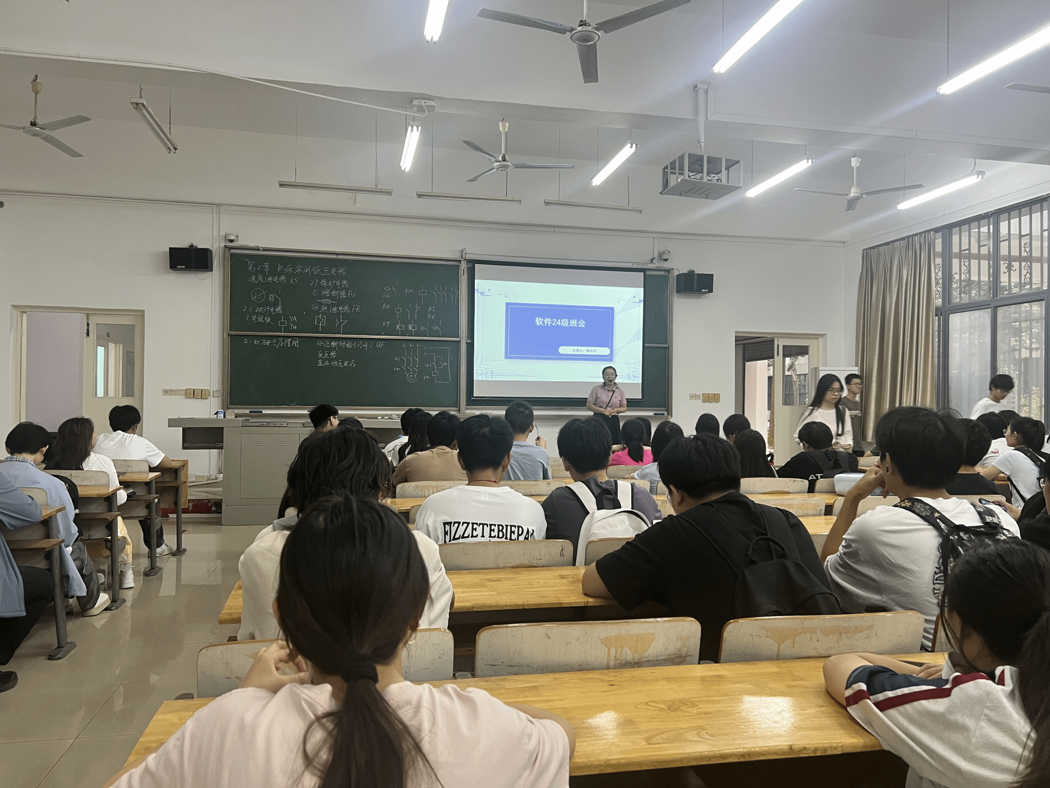 2025年9月18日9:45,钱小红老师和雷雨鹏老师在3-101教室一起给软件工程2024级学生开班会。