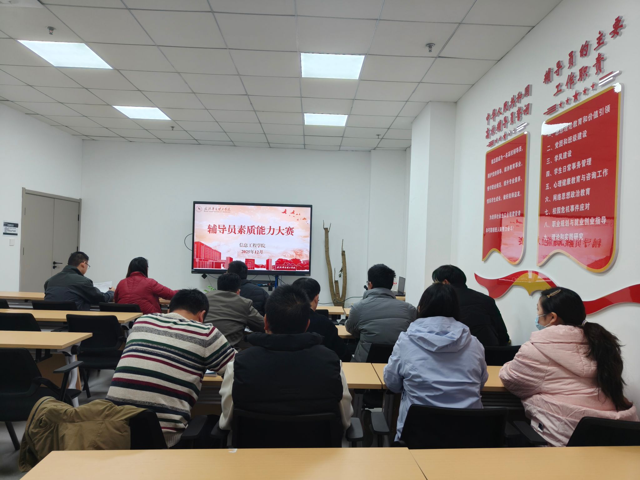 11月25日,信息工程学院2025年辅导员素质能力大赛学院选拔赛在综合楼一楼顺利举行。信息工程学院党总支副书记张平、学生工作办公室主任张琦、党总支组织员吴乐担任评委,学院全体辅导员参加活动,比赛由张琦主持。