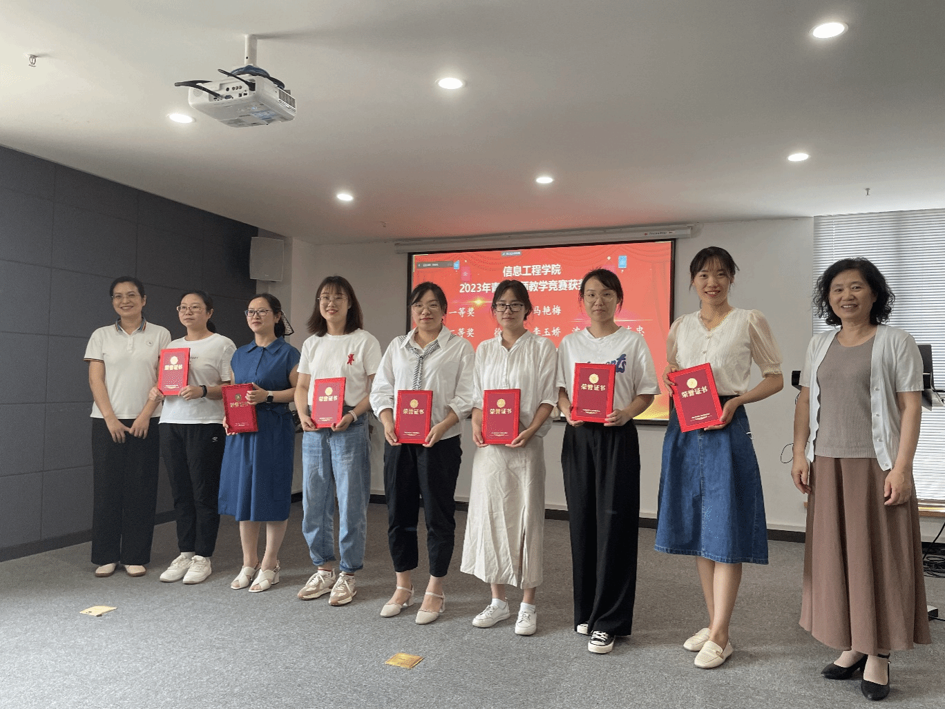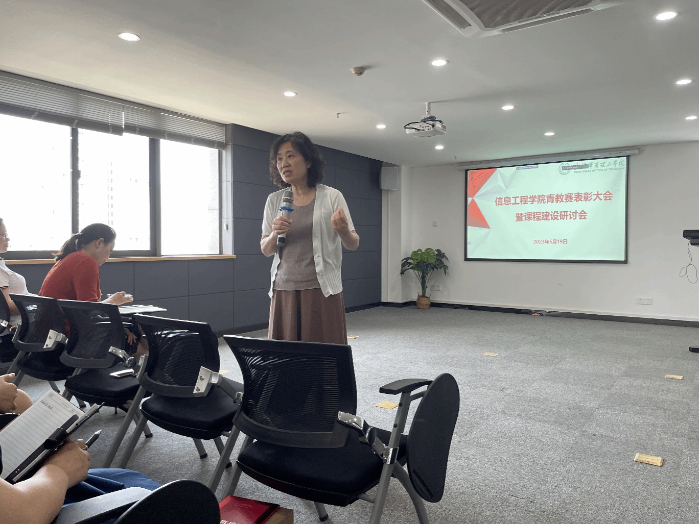 首先,副院长王绪梅宣读了学院青教赛表彰名单,院长王敏向受表彰的教师颁发了获奖证书并留影。然后,副院长梁梦凡分析了课程建设的现状,我院目前有《大学计算机基础》、《无线网络规划与系统优化》2门省级一流课程,《机器人原理及控制技术》等7门校级一流课程,《信号与系统》等6门在线开放课程,《程序设计基础》等11门课程思政示范课及达标课。结合在线开放课程建设的指标点、课程评估要求指标点,副院长梁梦凡进行了详尽的课程建设经验交流。最后,院长王敏做总结发言,王院长鼓励教师们加强课程建设,未来希望有更多的老师能进入到教赛省赛、国赛。