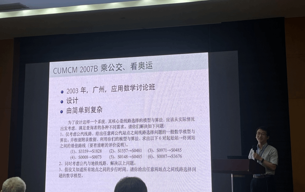 第二个作报告的是国防科技大学的毛紫阳副教授,他分享的是“数学建模竞赛命题经验和心得”。 毛副教授年轻有为,他是全国数学建模竞赛的命题组成员,近几年已经为该赛事贡献了五个题目,这是非常了不起的成绩。他的题目都是源于对生活敏锐的观察,比如2007年的“乘公交、看奥运”题源于2008年中国将第一次在北京举办奥运会,作为普通观众选择怎样的交通工具去省时省力,作者由此引发了思考,最终为建模大赛贡献了这个题目。2009年“眼科病床的合理安排”源于作者去眼科配镜检查时的思考。2013年“碎纸片的拼接复原”源于作者对纸片碎的程度取决于文件内容的秘密程度的思考。2016年的“小区开放对道路通行的影响”则源于作者参加某次重要会议遭遇的一次堵车赶时间事件。2019年的“‘同心协力’策略研究”则源于作者参加同学聚会时举办的颠乒乓球比赛。我觉得毛副教授之所以对生活有敏锐的观察一方面来源于扎实的专业基础知识,另一方面在于他具有将数学知识与实际生活中的应用联结起来的能力,即将数学知识应用于社会生活生产的能力。
