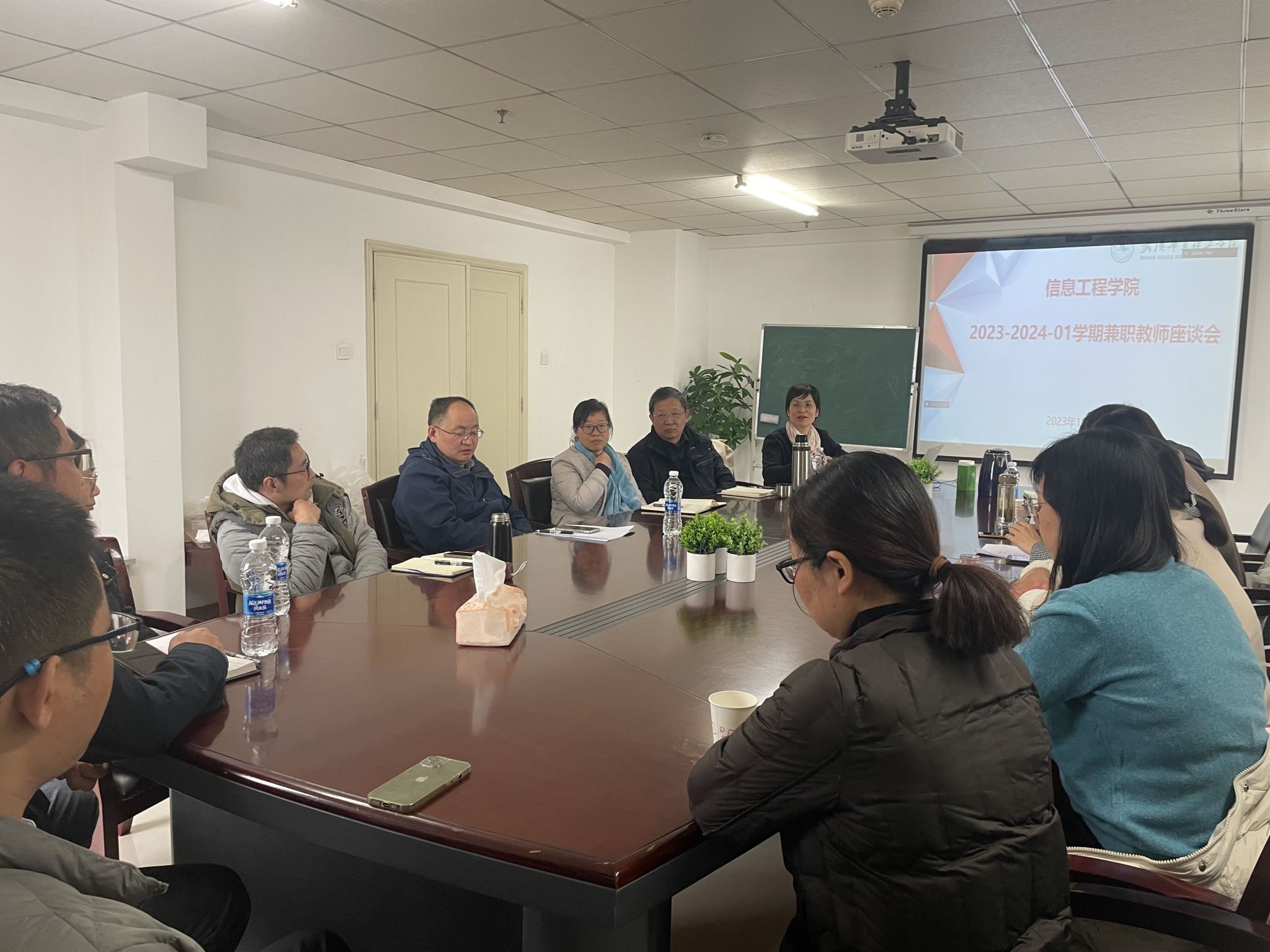 为落实学校期中教学检查工作安排,信息工程学院于11月13日中午12点40分,在综合楼702会议室,组织了期中教学检查兼职教师座谈会。院长王敏、有兼职教师的系部主任、及本学期任课的兼职教师参加了座谈会,座谈会邀请了学院兼职督导葛蓁参加,会议由教学副院长王绪梅主持。