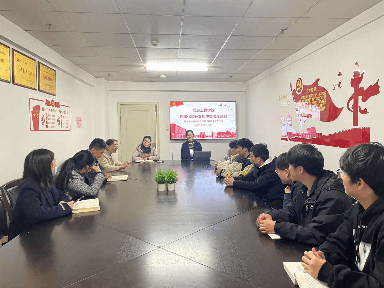 在2023-2024-1学期学校对教学工作进行中期检查之际,为查找教学过程中的漏洞与不足,获得学生的反馈信息,11月15日中午12:20在综合楼708会议室,自动化专业召集了第一届专升本班级——自动化3211班的学生代表进行座谈。参加座谈会的除了8位学生代表,还有信息工程学院行政副院长、院党总支书记张平,人工智能与自动化系主任袁丽平、副主任乔志刚和教师代表张素文、蔡金萍、李莉。