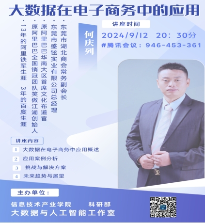 为促进学生深入理解技术需求,与课程、项目实际接轨。9月12日,大数据与人工智能工作室联合信息技术产业学院、科研部于线上举行数智讲堂暨暑期产业学堂活动之“大数据在电子商务中的应用”讲座。本次讲座由东莞市湖北商会常务副会长、东莞市盛铉实业有限公司总经理何庆列主讲。大数据与人工智能工作室全体师生及22级、23级数据科学与大数据技术专业部分学生参加活动,活动由大数据与人工智能工作室负责人陈志忠主持。