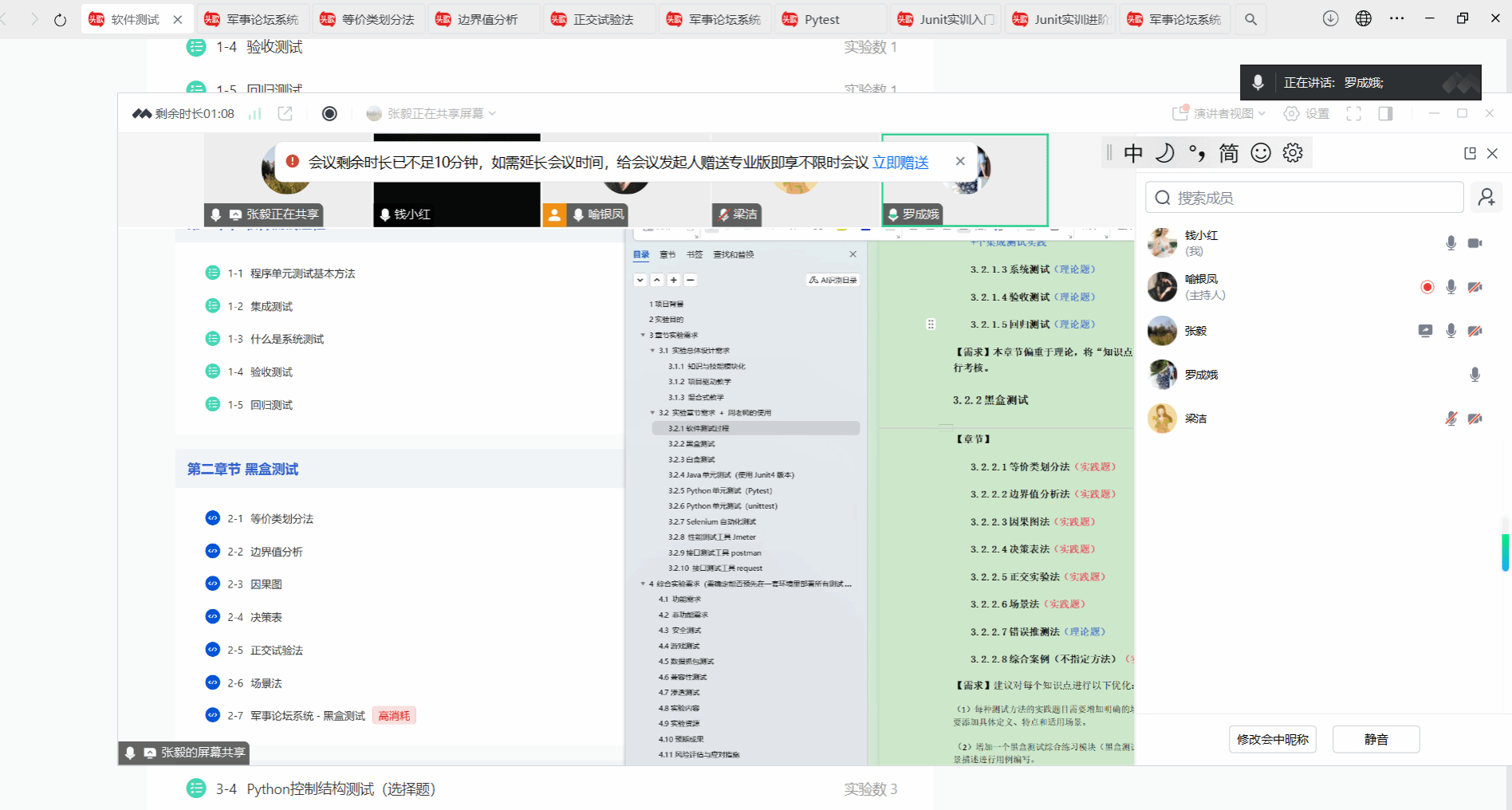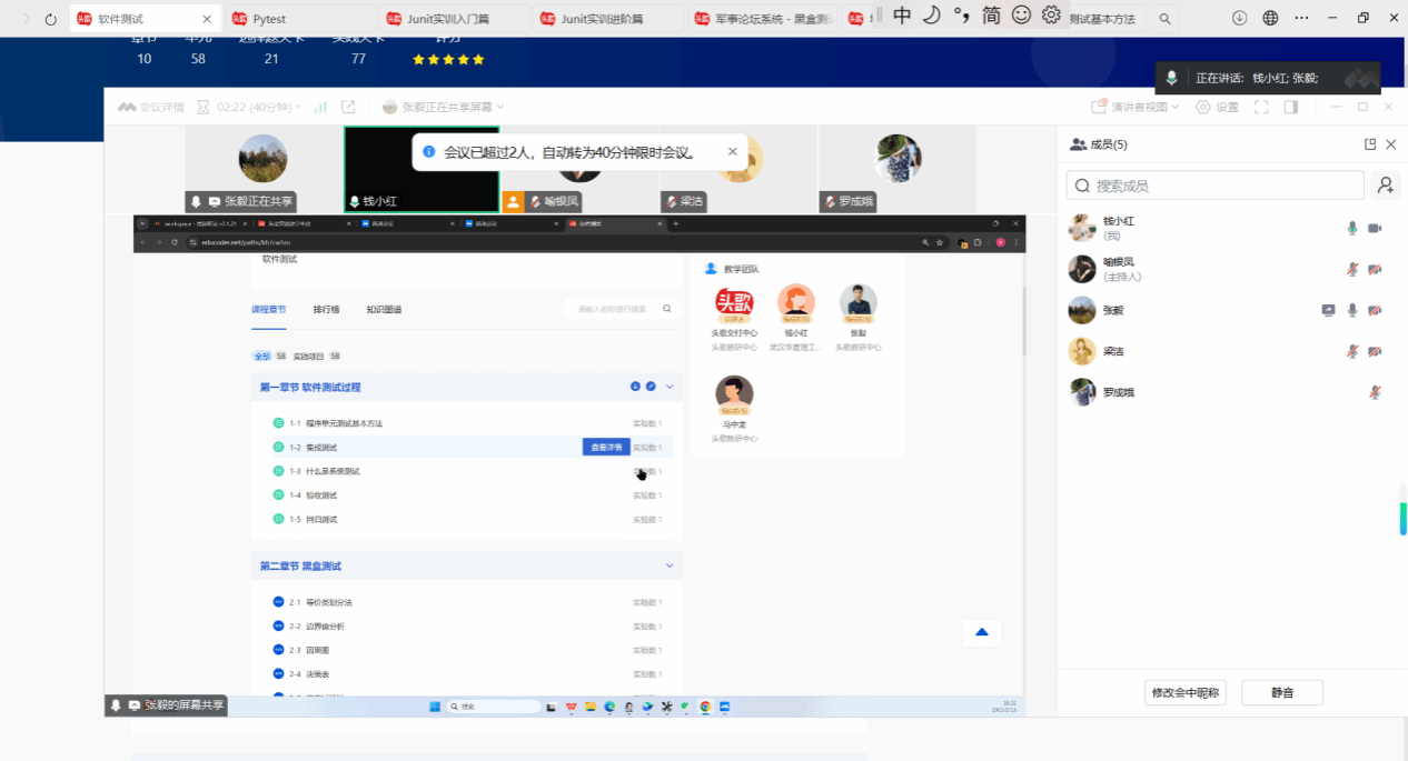 首先张毅老师就《软件测试实践课程技术及服务项目》目前完成的情况做了汇报和演示,钱小红老师提出头歌平台上《软件测试基础入门与实践》里有些实践项目也需要加入《软件测试实践课程技术及服务项目》以及需要加一款功能测试的软件,装在环境里,例如:UFT。然后梁洁老师提出各种测试里标注实践性的,需要用真实的场景、项目、或者需求+截图,白盒测试需要用脚本测试,安装类、操作类的闯关也需要自动评测,9-2节接口测试需要增加update add delete更新类,接口测试要连接口测试,让学生真实测试。后面罗成娥老师提出需要增加安全测试和移动测试android。张毅老师表示后面抓紧完成项目需求,并核对了项目需要完善的项。