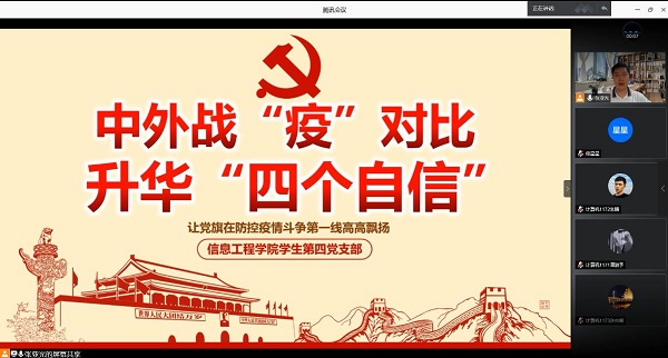 2020年7月29日上午11点,信息工程学院学生第四党支部通过腾讯会议网络视频平台开展了以中外战“疫”对比 升华“四个自信”为主题的微党课活动。本次网络视频党课由党支部书记张亚光主讲,学生第四党支部全体党员参与此次会议。