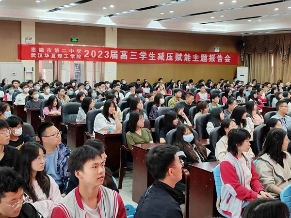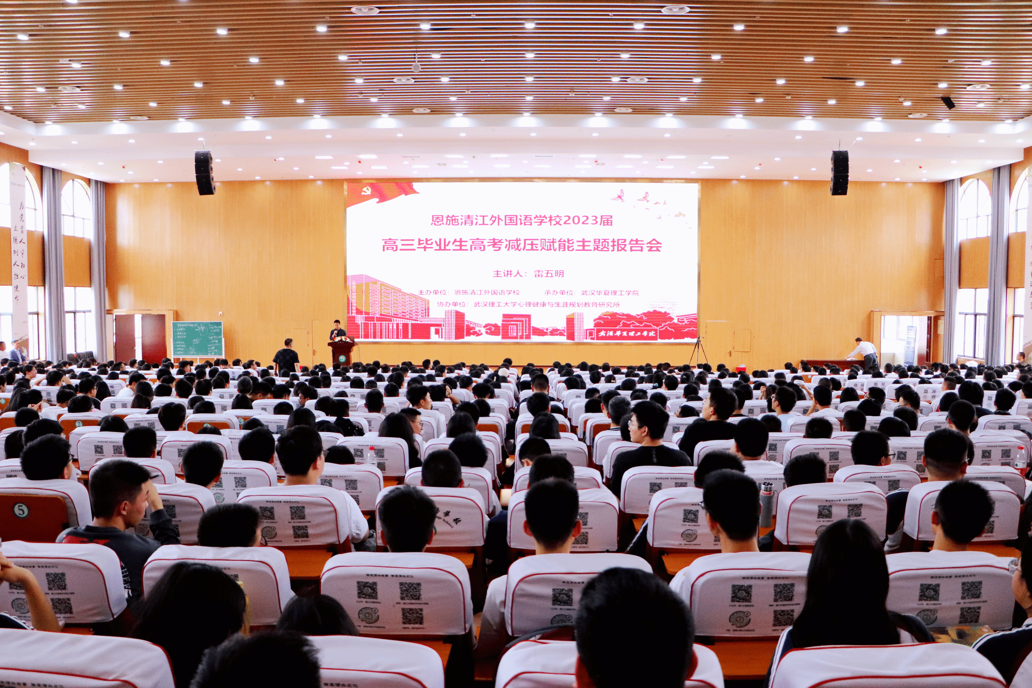 5月14日,为加强生源基地建设,帮助高三学生缓解考前心理压力,beat365邀请武汉理工大学雷五明教授为优质生源基地恩施市第二中学和清江外国语学校做《鹤舞白沙 我心飞翔》主题讲座,两校高三年级班主任、1800余名高三年级学生聆听讲座。恩施市第二中学工会主席魏红光,清江外国语学校高中部副校长杨永智,beat365官方网站纪委副书记靳路民、心理健康教育中心主任韩志来、信息工程学院辅导员万王旋参加活动。