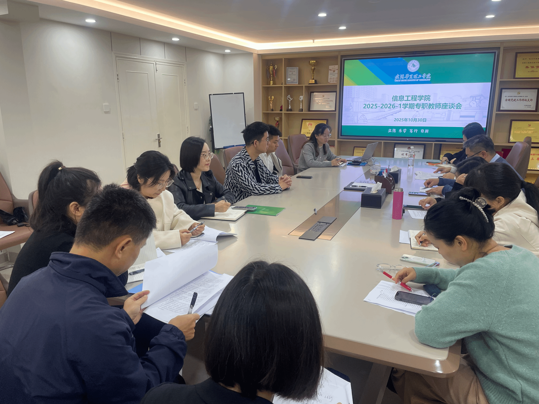 为进一步加强教风学风建设,提升课堂教学管理水平,促进教师之间的经验交流与共同成长,信息工程学院于10月30日上午10:30在综合楼702会议室召开了2025-2026-1学期专职教师座谈会。会议由赵京副院长主持,学院各系部专职教师代表及科研部张城芳部长参加了此次会议。