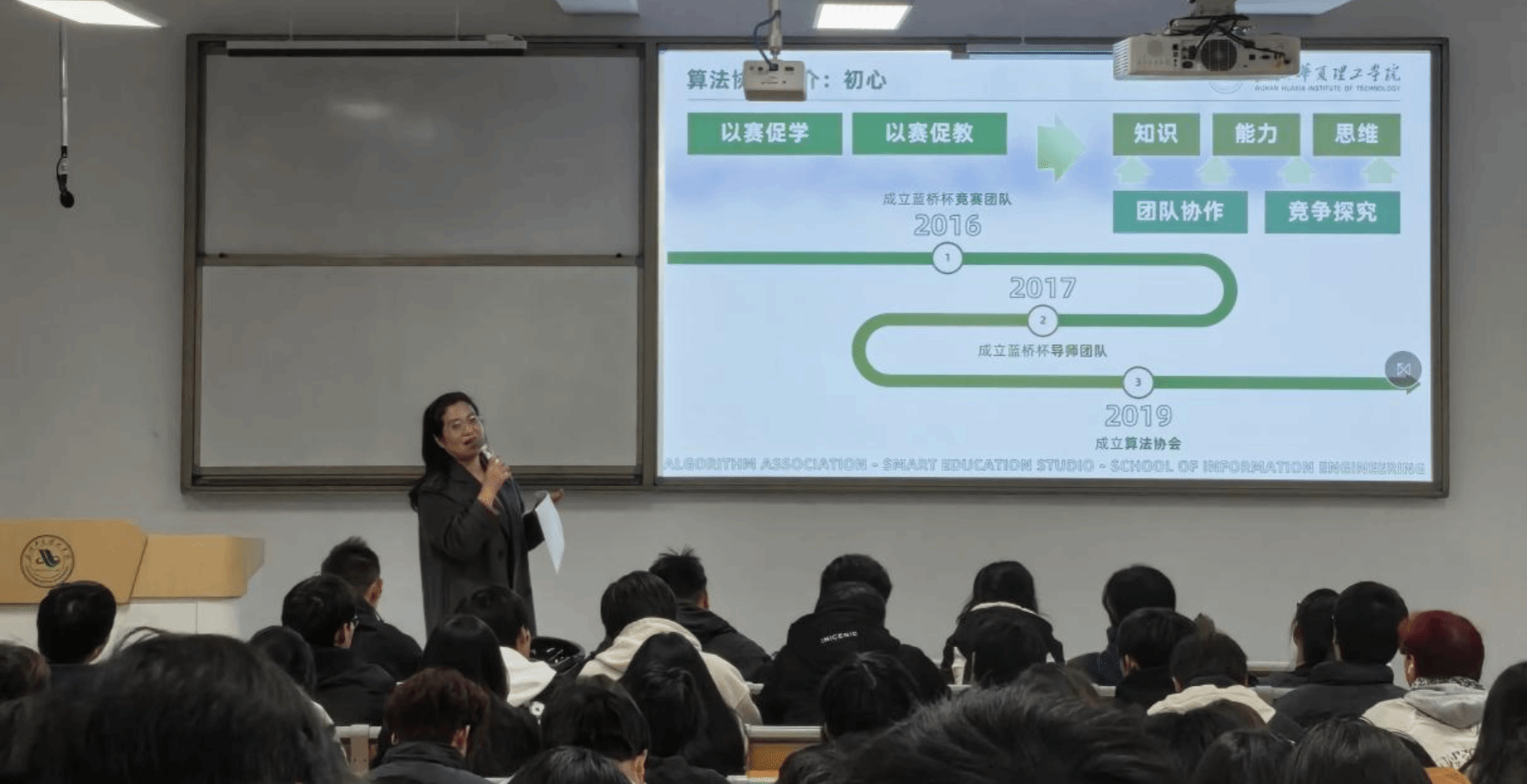 信息工程学院王绪梅院长于11月23日晚间开展算法协会招新动员大会,正式拉开该协会新一轮招新序幕。作为学校编程与竞赛领域的核心组织,算法协会以完善的培养体系、深厚的竞赛积淀,为全校学子搭建起编程学习与能力提升的优质平台。参会老师有信息工程学院周熠、李洋老师。
