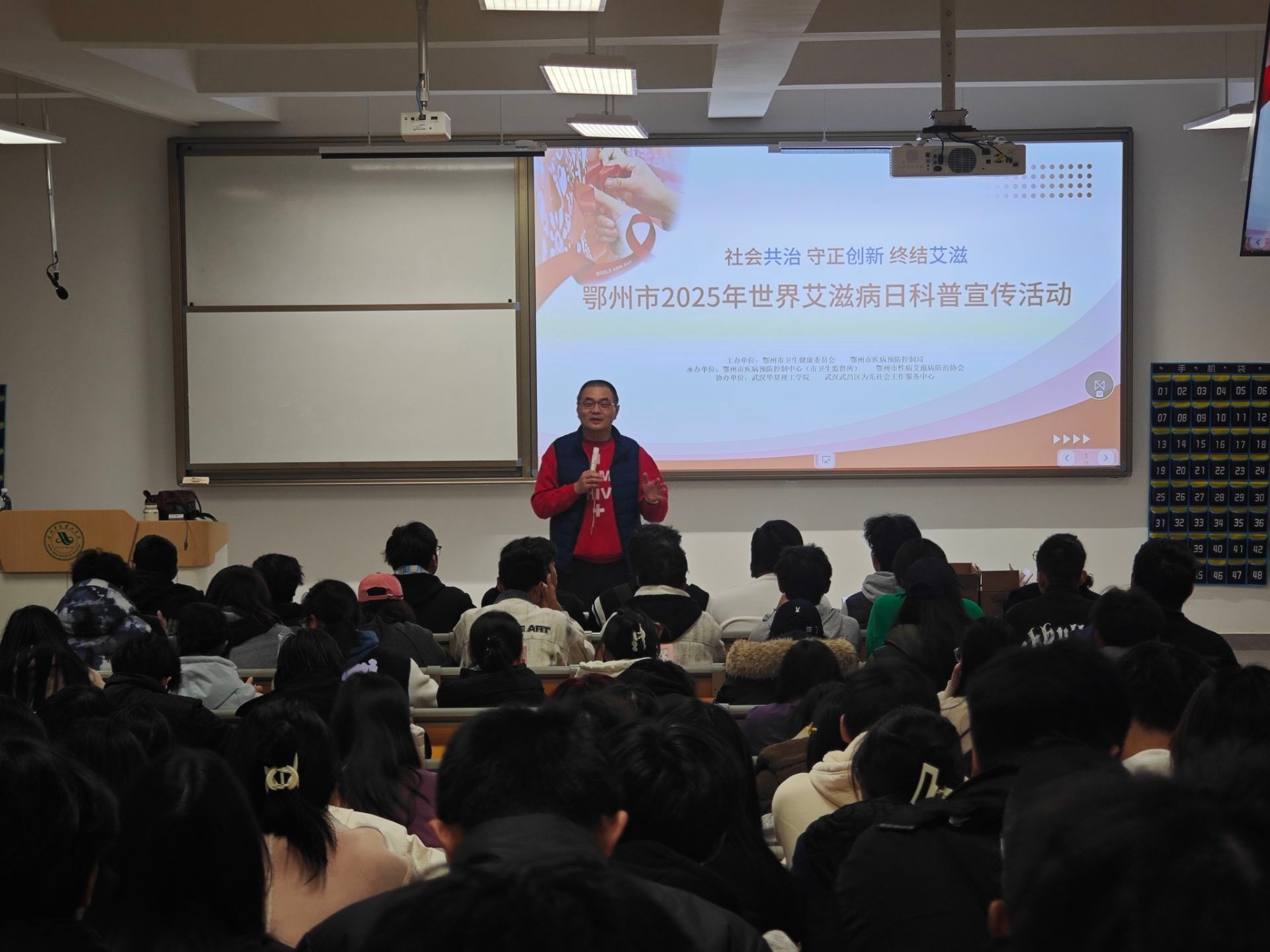 为进一步普及艾滋病防治知识,提升学生自我保护意识与健康素养,营造科学防艾、关爱包容的校园氛围,11月26日晚,信息工程学院在梧桐湖校区C317教室隆重举办艾滋病科普宣传讲座。本次讲座由心理健康教育中心主任韩志来主讲,学院计算机、软件、人工智能专业学生到场聆听学习。