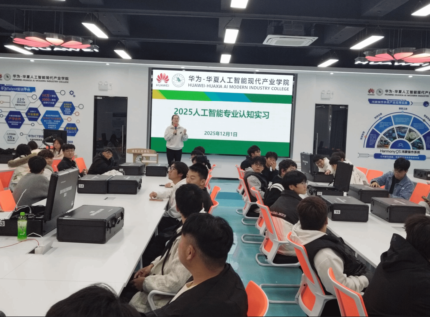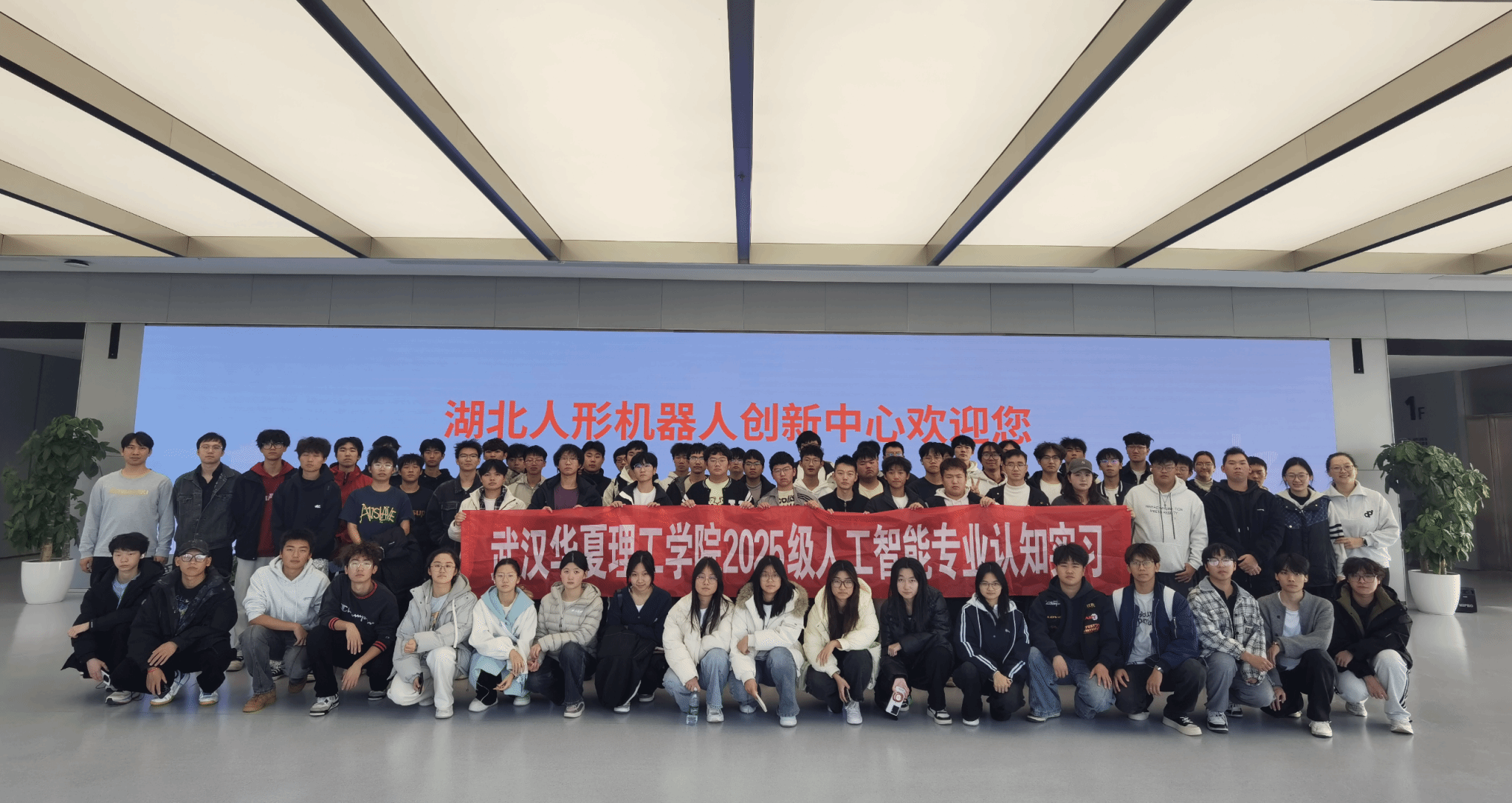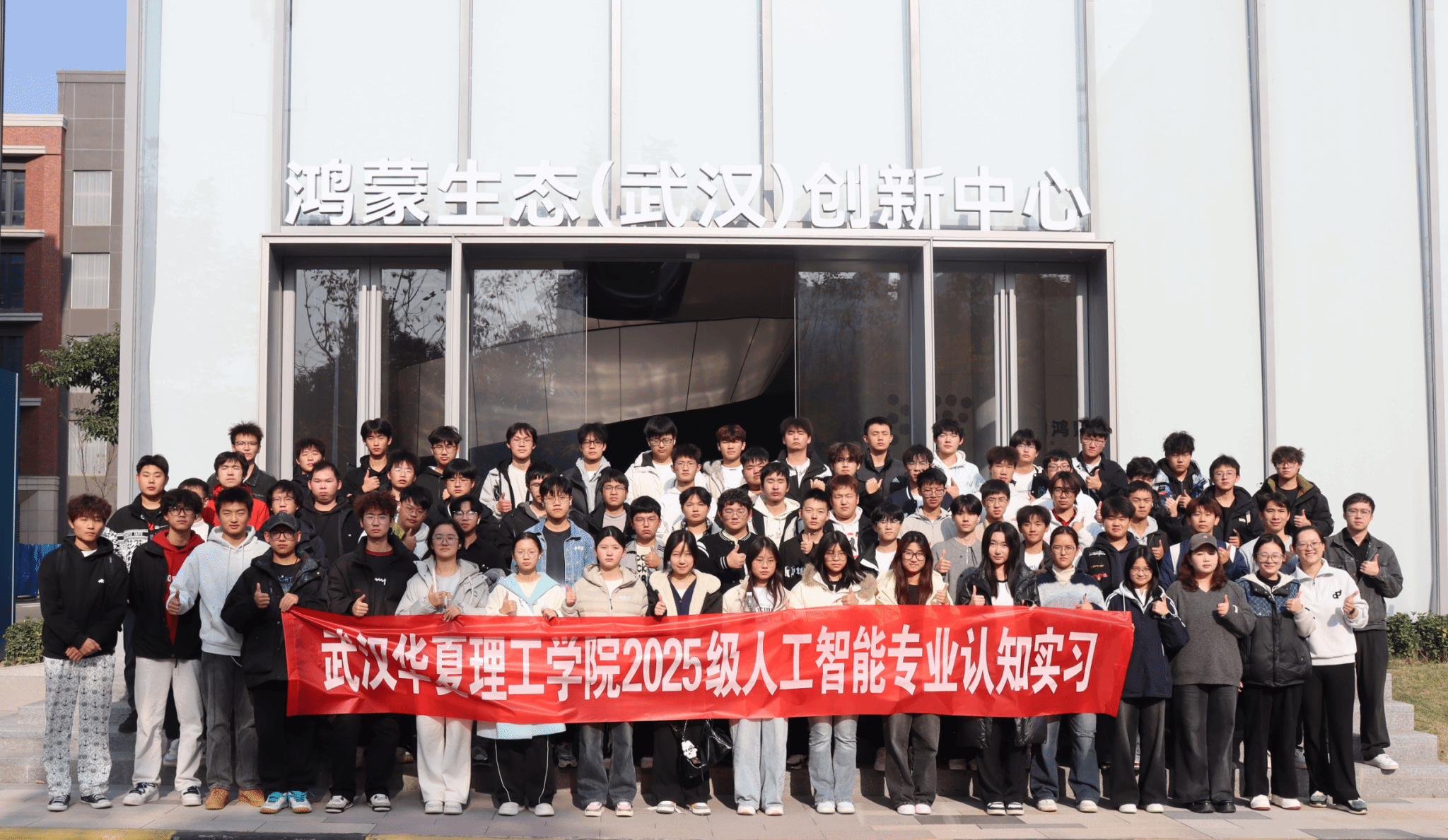 为助力2025级人工智能专业新生更好地了解人工智能行业发展前沿,明确专业学习方向,激发学习热情与探索精神,2025年12月1日,袁丽平、柯宇曦、陈安澜、余晓燕4位老师带领人工智能专业25级新生开展了一场别开生面的专业认知实习活动。同学们先后走进鸿蒙生态(武汉)创新中心、湖北人形机器人创新中心,并返回光谷本校区参观了华为华夏人工智能现代产业学院及人工智能与机器人实验室,开启了一段充满科技感与未来感的探索之旅。