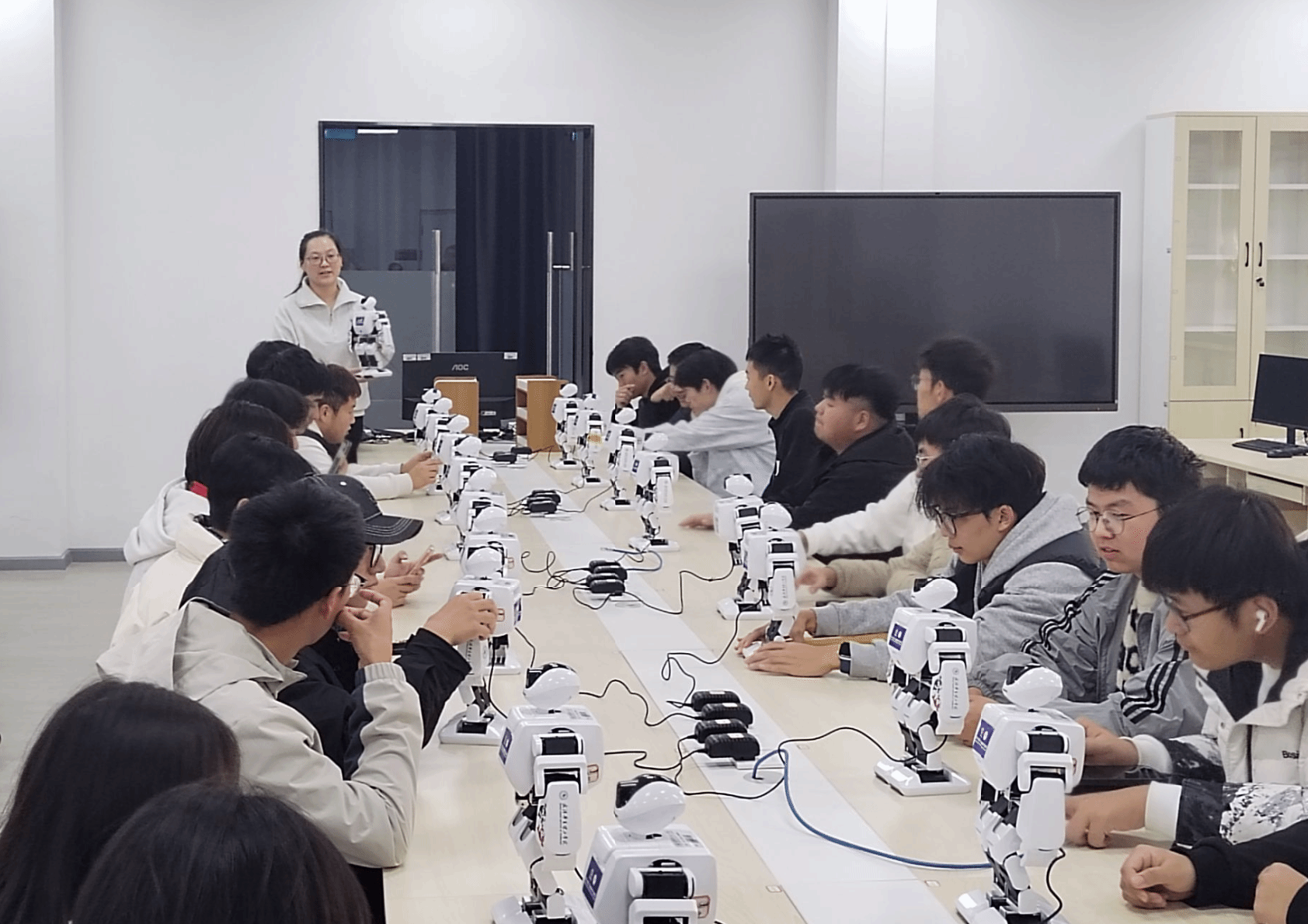 随后,队伍来到湖北人形机器人创新中心。在这里,一系列形态各异、功能强大的人形机器人瞬间吸引了所有人的目光。从灵巧的机械臂操作到复杂环境下的自主行走,从人机交互对话到特定任务的智能执行,同学们近距离观察了人形机器人的关键技术与最新研究成果。工程师们详细介绍了机器人在医疗康复、物流配送、服务陪护等领域的应用前景,并就同学们提出的关于机器人感知、决策、控制等方面的问题进行了耐心解答。面对这些“未来伙伴”,新生们表现出了浓厚的兴趣,不时发出阵阵赞叹,对人形机器人技术的发展潜力有了更深刻的理解。