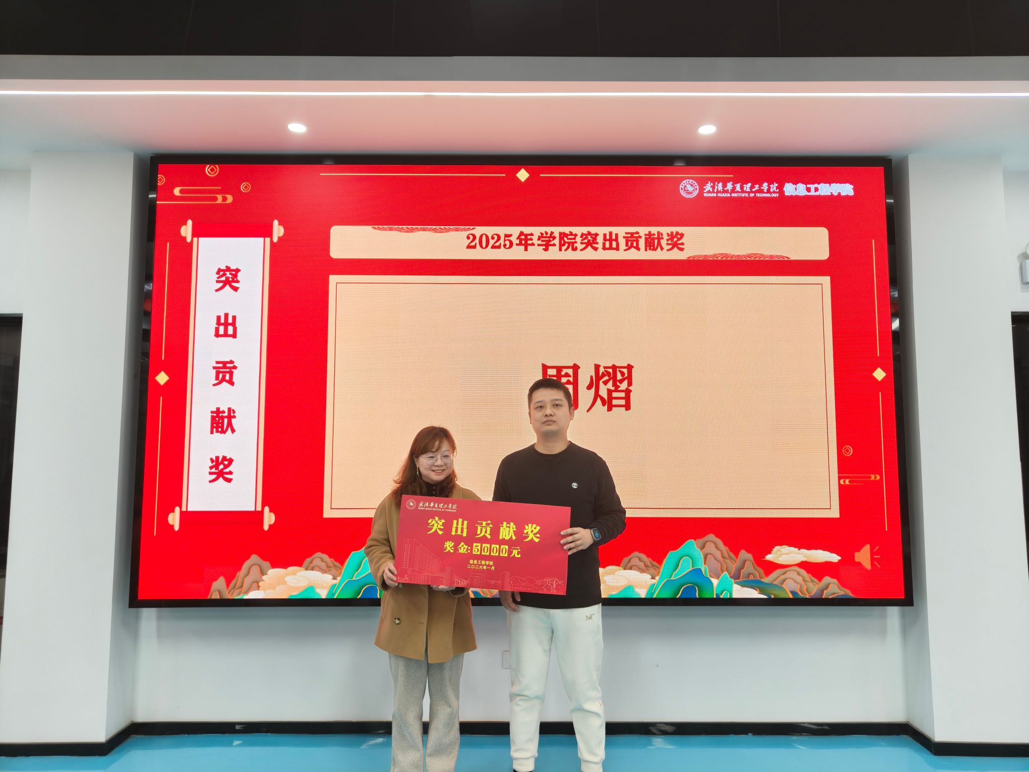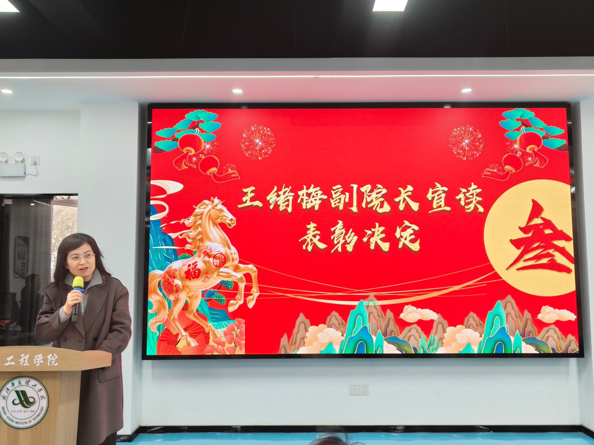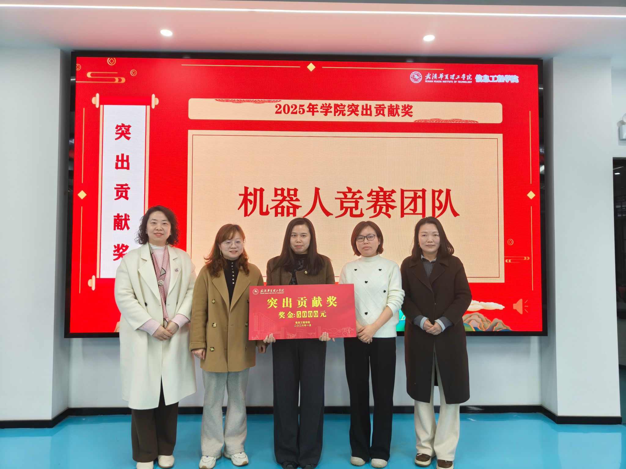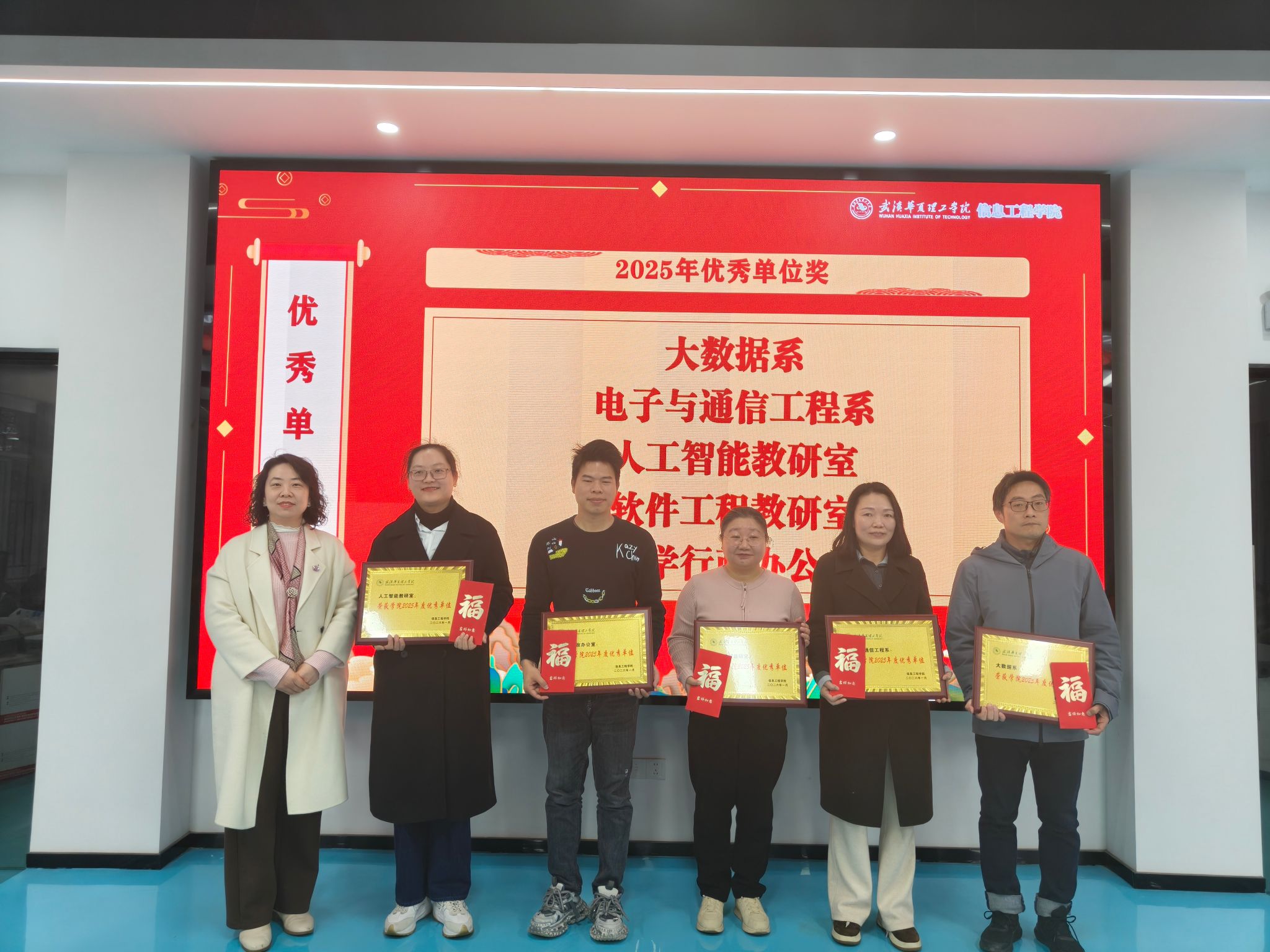 第三环节,王绪梅宣读了2025年度先进集体与个人表彰决定。本年度设立“突出贡献奖”和“优秀单位”两类奖项。周熠因积极推动学科与产业对接,成为学校首位华为全球开发者专家与开发者布道师,并协助学校成功加入全球智慧物联网联盟,其指导的学生团队在《2025统计科学与算法编程挑战赛》中荣获一等奖1项、二等奖3项、三等奖3项。电赛指导教师团队阮波、章科峰、熊利祥、唐嘉乐、赵京、王行娟凭借扎实的专业能力与全程悉心指导,带领学生在2025年全国大学生电子设计竞赛中取得历史最佳成绩,共获省级一等奖3项、二等奖1项、三等奖2项。睿抗机器人竞赛指导教师团队梁梦凡、赵京、李莉、苏明霞、王行娟坚持“以赛促学、以赛促教”,三年来累计指导学生获得国赛一等奖6项、二等奖4项、三等奖4项,省赛一等奖9项、二等奖7项、三等奖4项。教学行政办公室在保障日常教学运行与本科合格评估工作中表现突出,荣获“优秀单位”。此外,大数据系、电子与通信工程系、人工智能教研室、软件工程教研室四个单位获评学校优秀基层教学组织。