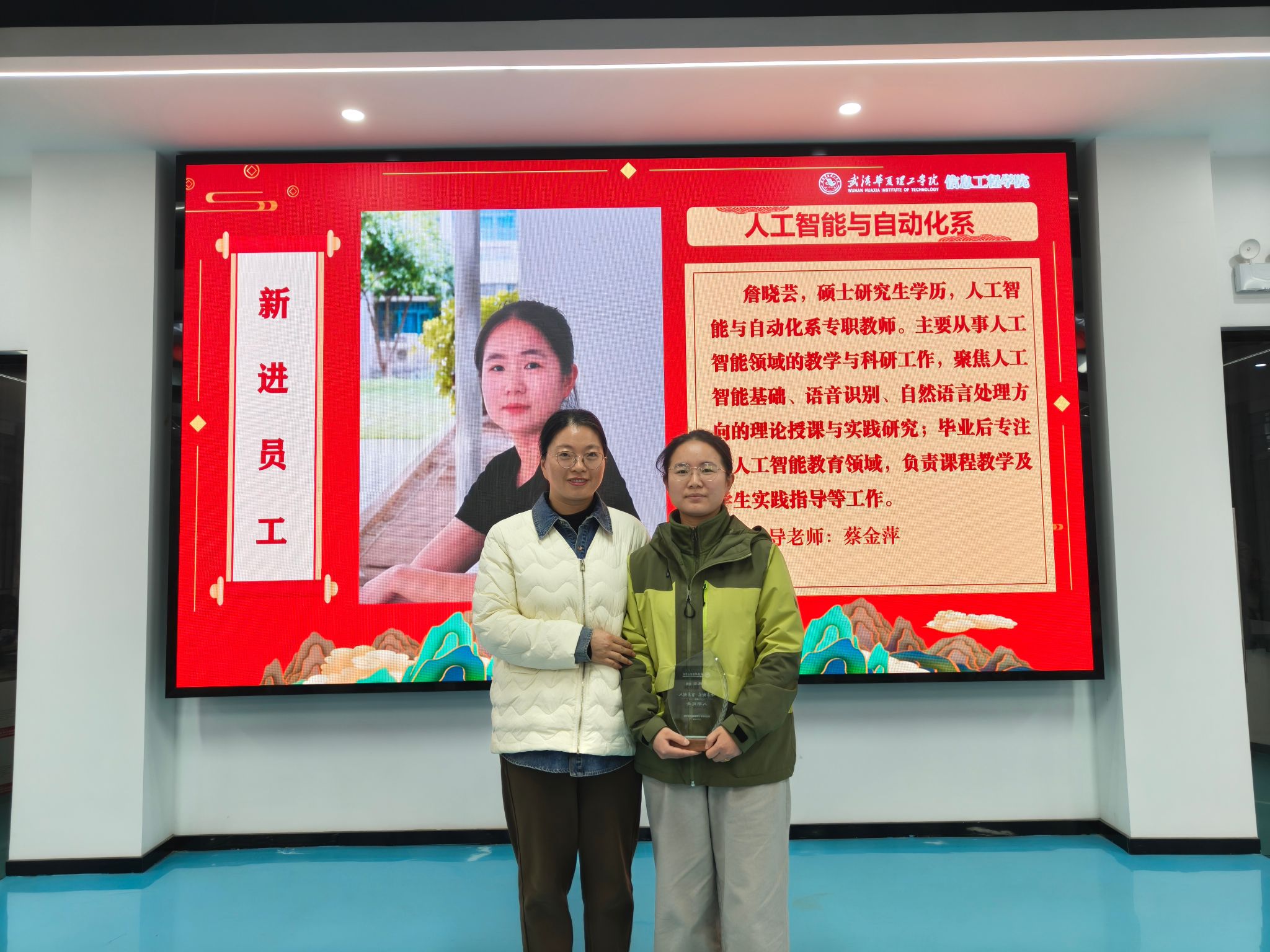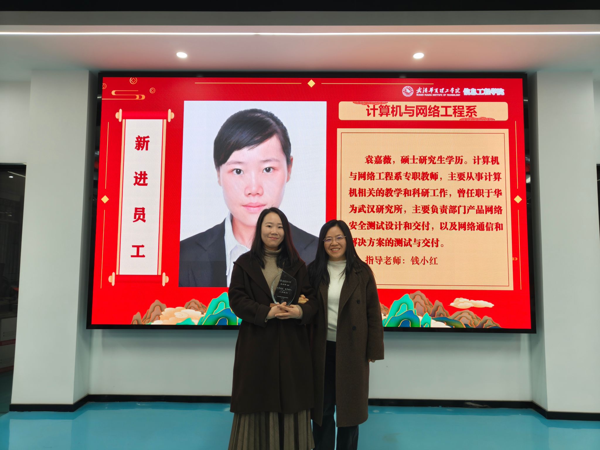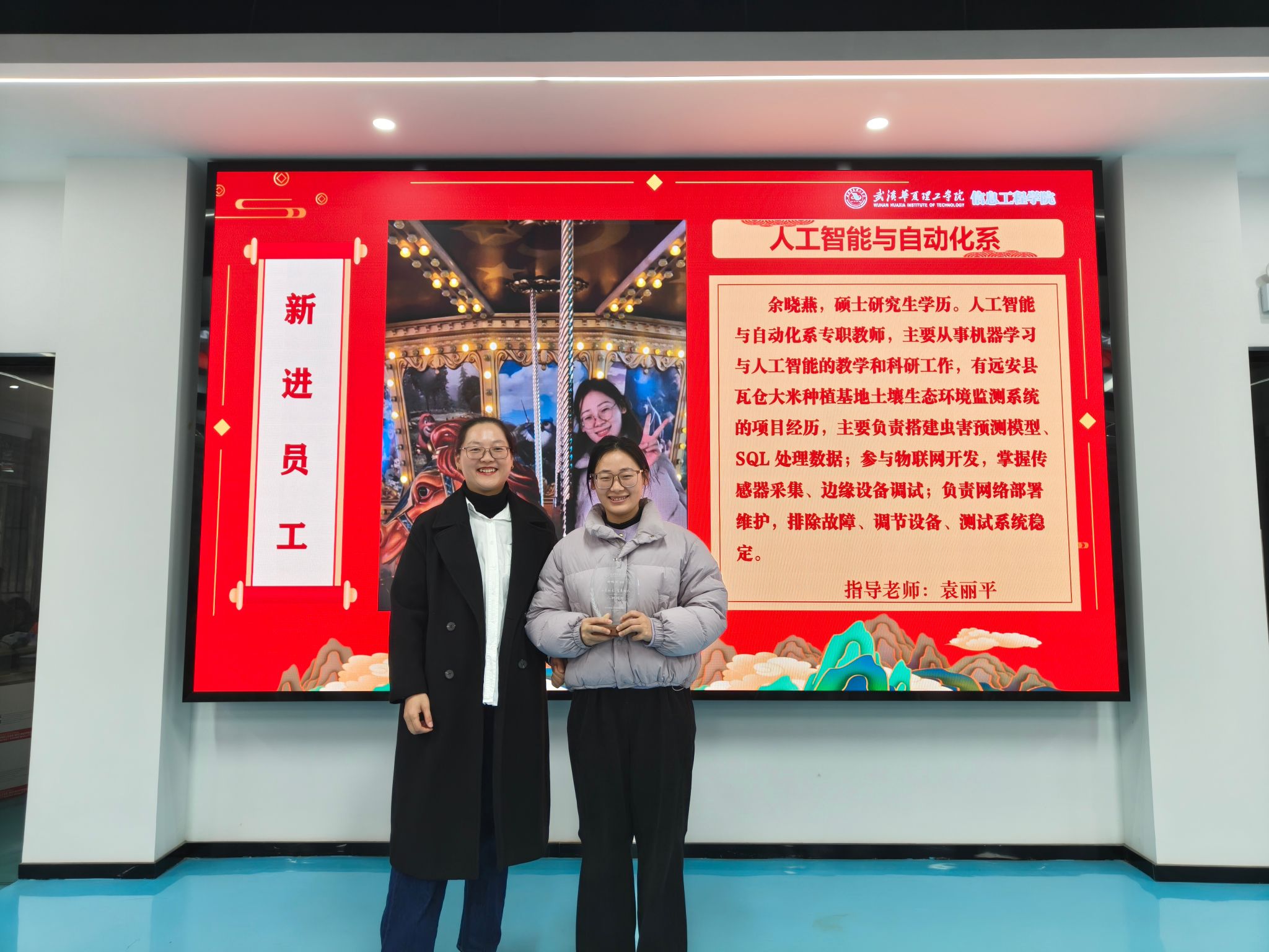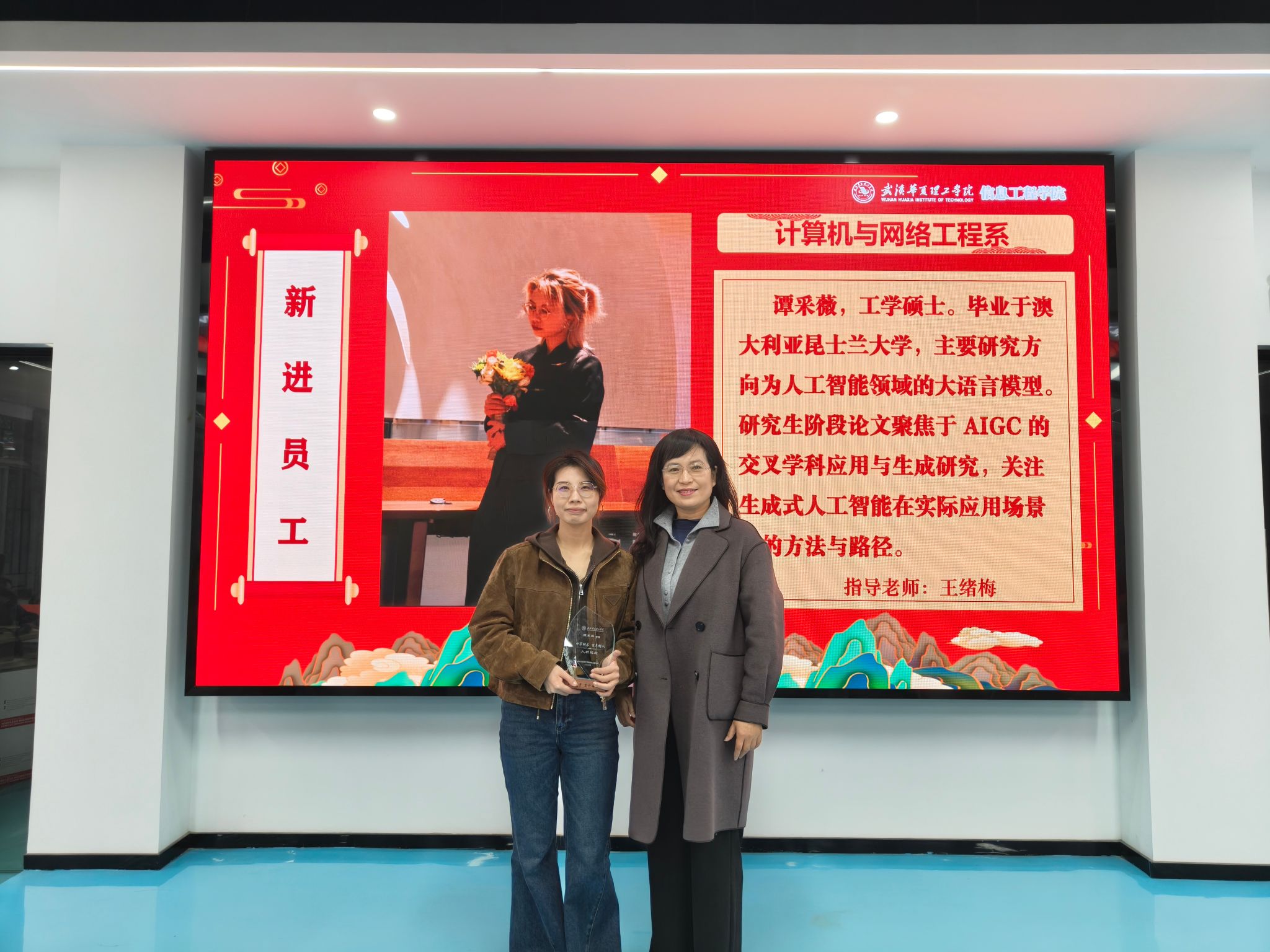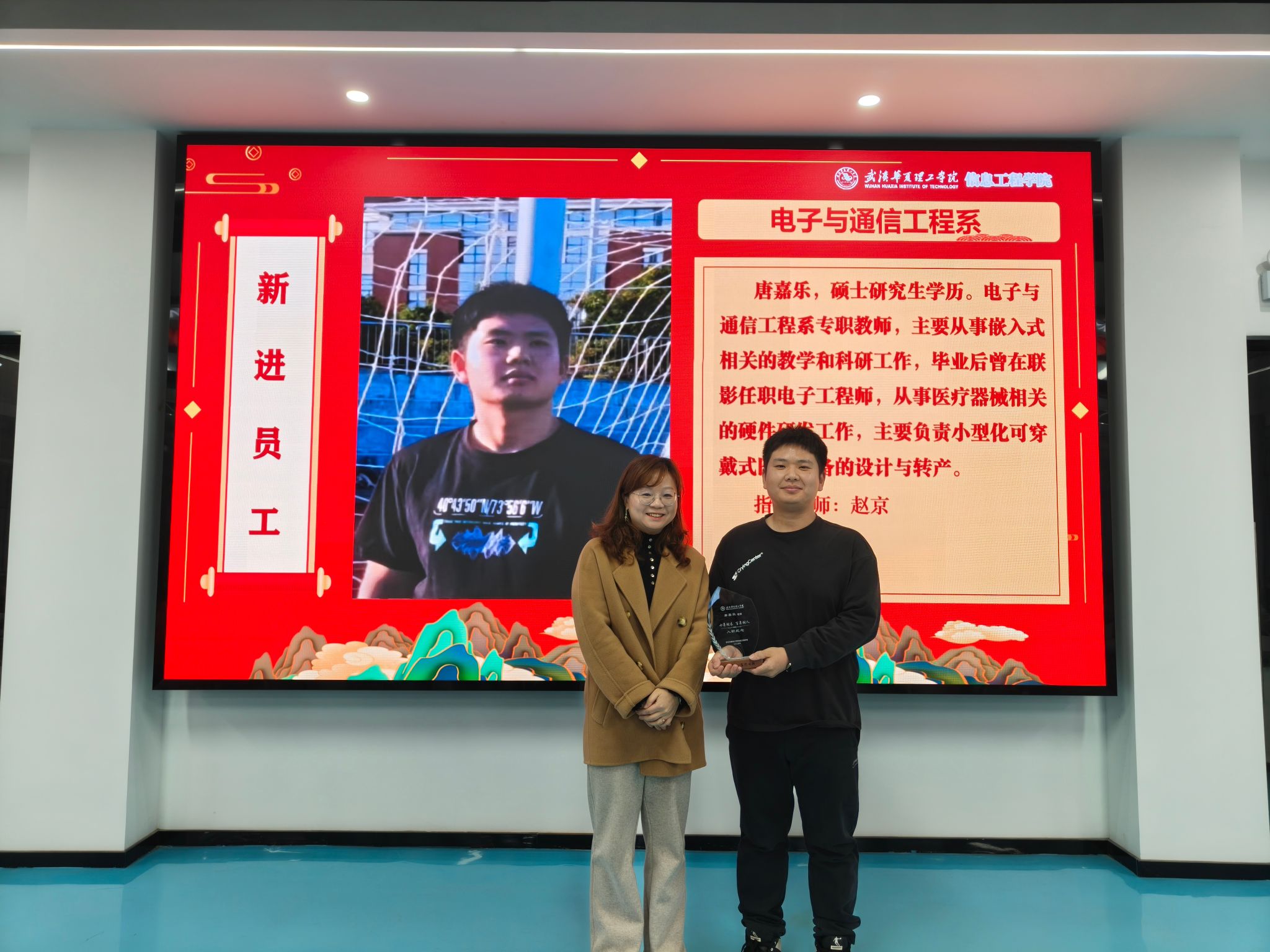 第三环节,王绪梅宣读了2025年度先进集体与个人表彰决定。本年度设立“突出贡献奖”和“优秀单位”两类奖项。周熠因积极推动学科与产业对接,成为学校首位华为全球开发者专家与开发者布道师,并协助学校成功加入全球智慧物联网联盟,其指导的学生团队在《2025统计科学与算法编程挑战赛》中荣获一等奖1项、二等奖3项、三等奖3项。电赛指导教师团队阮波、章科峰、熊利祥、唐嘉乐、赵京、王行娟凭借扎实的专业能力与全程悉心指导,带领学生在2025年全国大学生电子设计竞赛中取得历史最佳成绩,共获省级一等奖3项、二等奖1项、三等奖2项。睿抗机器人竞赛指导教师团队梁梦凡、赵京、李莉、苏明霞、王行娟坚持“以赛促学、以赛促教”,三年来累计指导学生获得国赛一等奖6项、二等奖4项、三等奖4项,省赛一等奖9项、二等奖7项、三等奖4项。教学行政办公室在保障日常教学运行与本科合格评估工作中表现突出,荣获“优秀单位”。此外,大数据系、电子与通信工程系、人工智能教研室、软件工程教研室四个单位获评学校优秀基层教学组织。