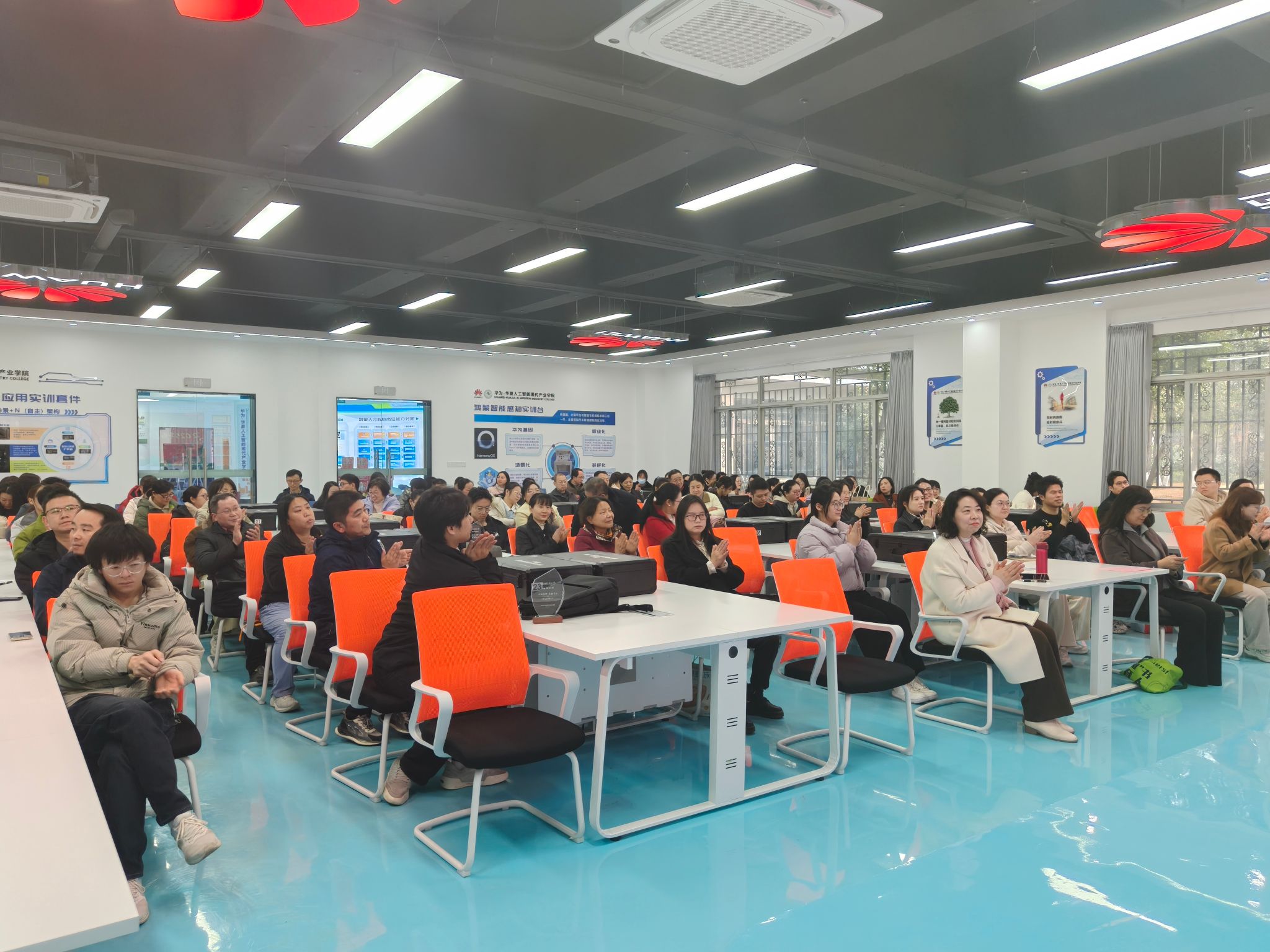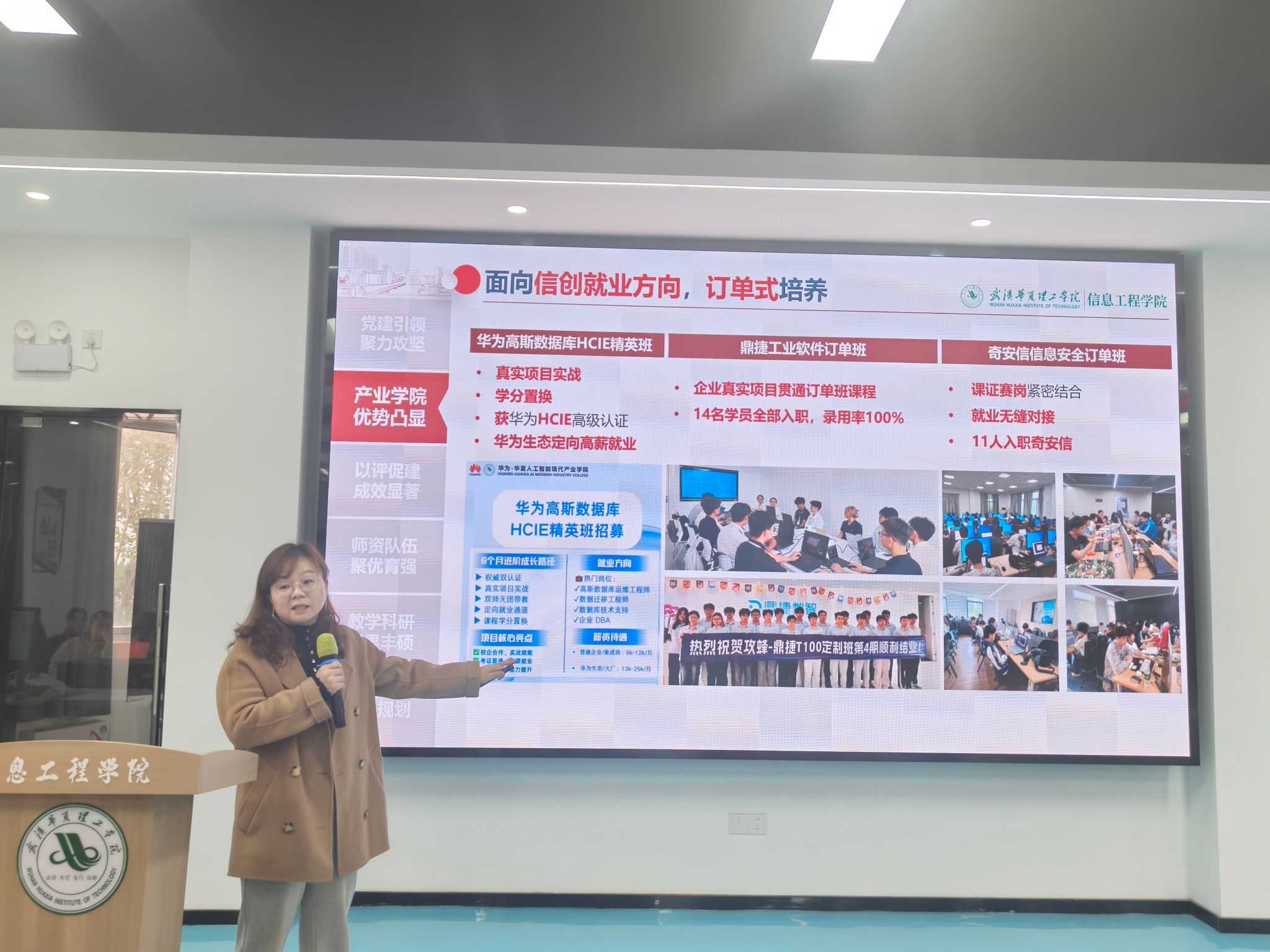 在第二环节的年度工作总结报告中,赵京以“迎评促建强根基 产教融合创佳绩”为主题,全面回顾了学院在2025年取得的六大成就:党建工作方面,教工一支部开展了全国党建工作样板支部结项验收,学院也完成了第五批全国党建工作标杆院系的申报;产业学院建设方面,建成了湖北省首家华为现代产业学院,通过校企协同授课深化产教融合,获评“鸿蒙人才培养优秀院校”;教学提升方面,以本科教学合格评估为契机,通过硬件升级和教学规范实现了教学质量显著提升;师资建设方面,通过制度化考核、精准培训和结对传承机制等措施,促使多名教师获得华为讲师认证,实现队伍量与质的同步提升;教研成果方面,获批3项省级新工科项目和2项教改项目,在全国教学竞赛中屡获佳绩,并发表多篇高水平论文;未来规划方面,学院明确将重点布局具身经济与低空经济领域,致力于将华为现代产业学院建设成为全国标杆。