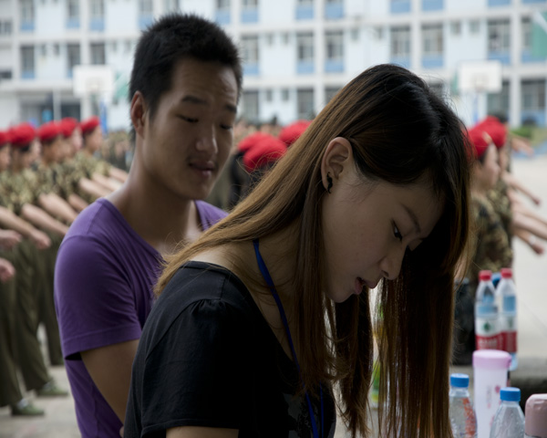 也许有人会问,当学长班主任累吗,“累那是肯定的,但这对自己也是一个很好的锻炼”几乎所有的学长班主任都有这样的表示。适逢开学这几天新生在烈日下军训,我们的记者团同学来到操场用相机记录了一些他们的身影。在与一些学长班主任的攀谈中,我们了解到他们军训这几天他们都是六点起床,跟大一新生的作息时间一样,没课的时间都是陪着班上的同学度过,他们也似乎亲自参与了军训。