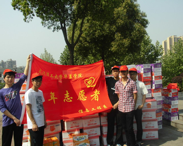 在地震发生后,全院师生深表哀痛,在第一时间里,全院各志愿者组织、刘普林小组及户外社共同发起了募捐活动,本次募捐时间持续三天各组织在不同的寝室楼前定点募捐,有的同学捐了雨伞、泡面、压缩饼干,并希望这些物品能带到灾区人民身边,补充他们生活所需。为期三天的募捐共募得善款12636.6元,这笔款项用于购买食物、女性用品和水,具体购买物资有:泡面100箱、老北京方便面220箱、小面包50箱、火腿14箱、女性用品15件、棉被12床、水12提,本批救灾物质由院青协统一从批发市场采购,此时志愿者们搬运的就是即将发往雅安的救灾物资。通过采访在场的一位志愿者我们了解,这批物资会贴上武汉理工大学华夏学院志愿者的标签并盖章,不经过中间任何环节,直接送往灾区。虽然此时太阳比较大,但是在场的志愿者坚持把物品搬运上车,他们用自己的双手将爱心传送到雅安,此刻,他们搬运的不仅仅是几箱日常生活用品,更是华夏学子沉甸甸的爱心和对雅安同胞的爱。