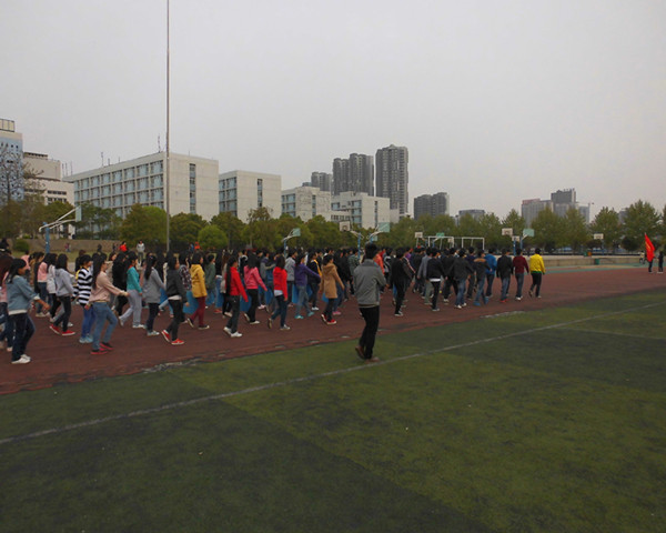 2013年4月9日,学校主干道上信息系开始了运动会前期方阵训练,系学工办主任张晓、辅导员杨震老师进行现场巡视和指导。