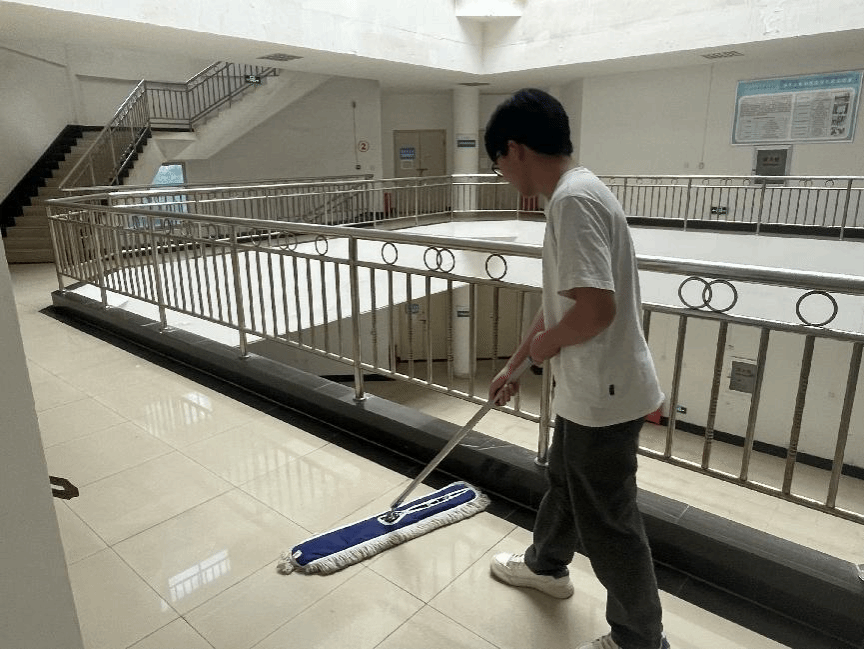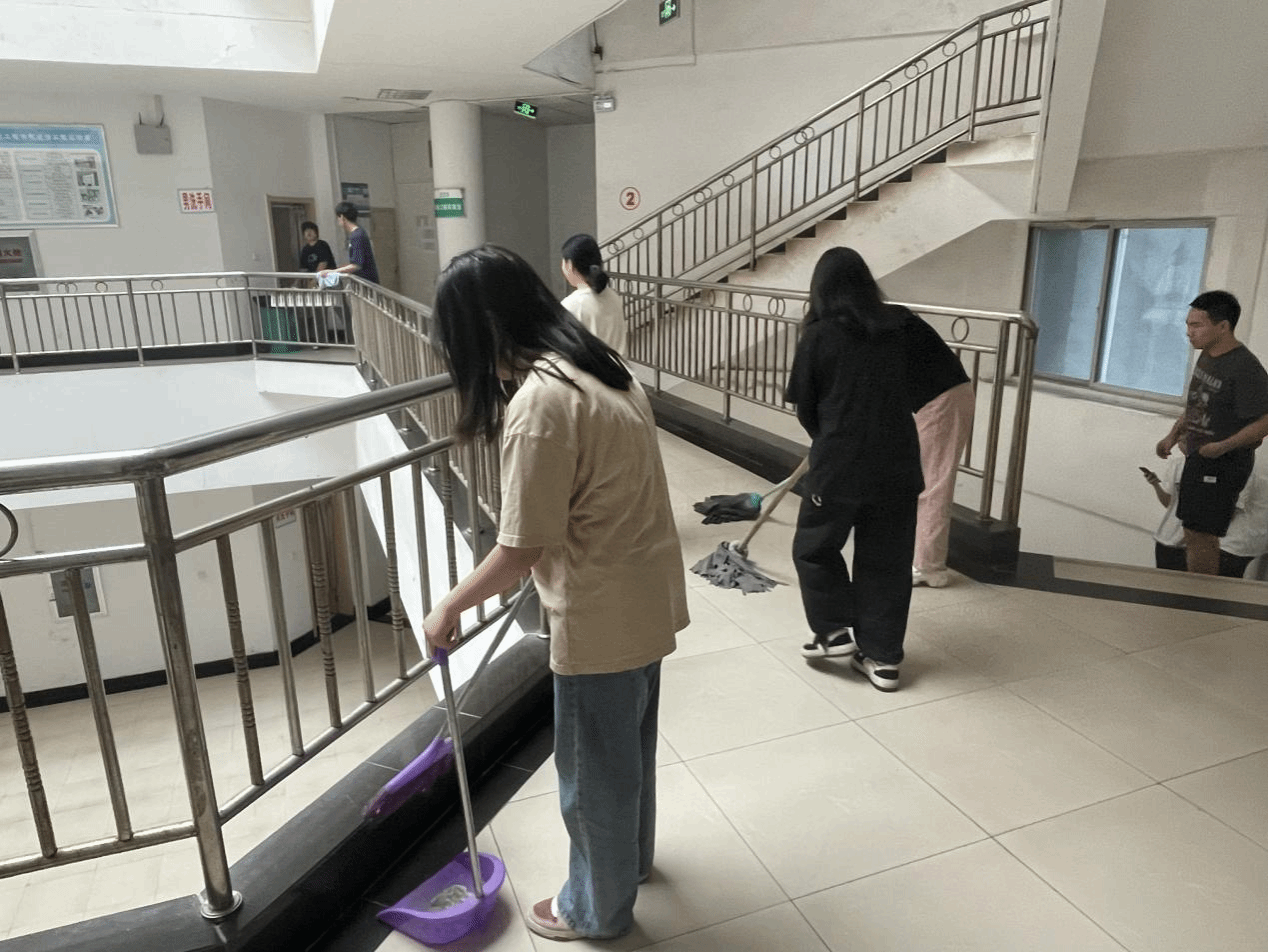 活动当天,所有成员在一楼大厅集合,大家佩戴好手套,拿起扫帚、拖把和清洁剂,按照事先分工有序进行清洁工作。大家分成几个小组,有的擦拭扶手,有的拖地,有的清理垃圾。尽管天气炎热,但大家干劲十足,互相配合,认真细致地清扫每一个角落。通过大家的共同努力,教学楼大厅焕然一新,环境变得更加整洁。