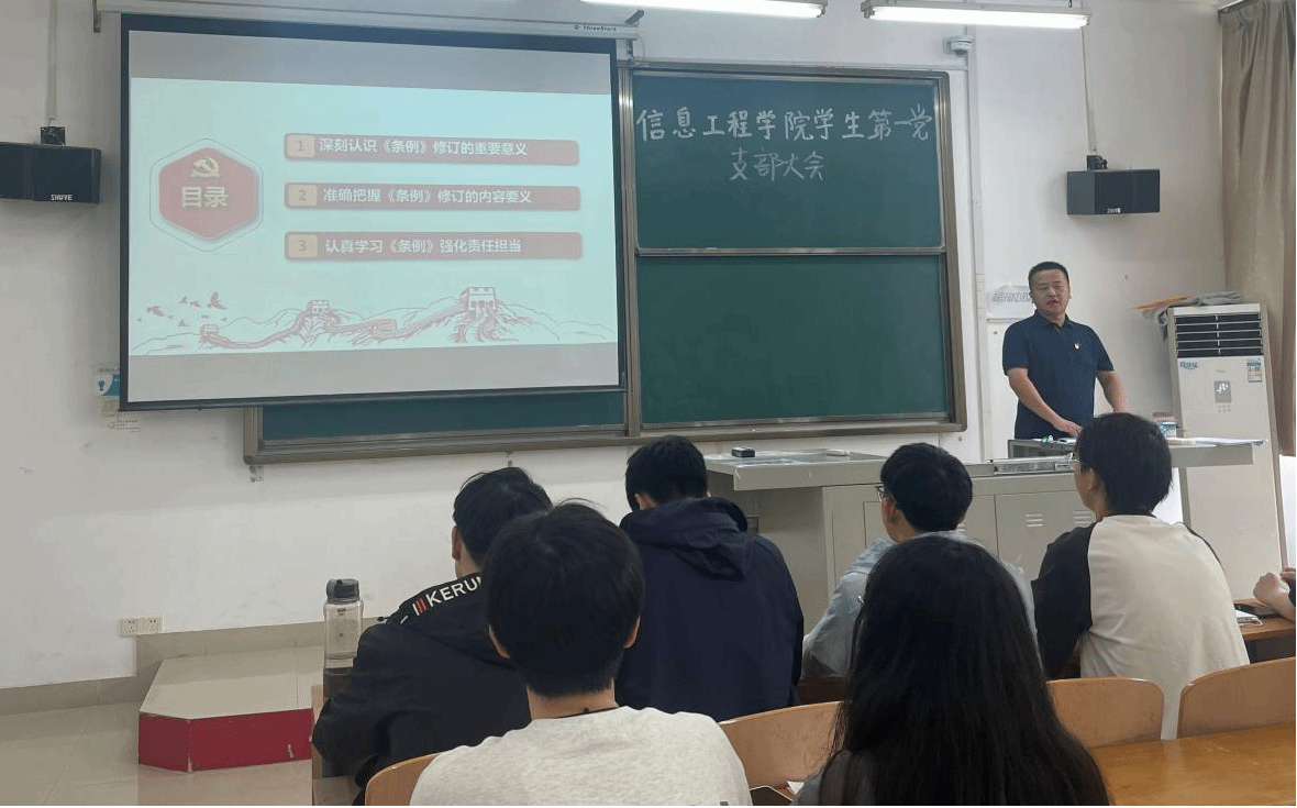 为扎实开展党纪学习教育,引导全体党员干部进一步做到学纪、知纪、明纪、守纪,2024年6月13日中午,我院学生一支部开展《中国共产党纪律处分条例》内容解读活动。活动由学生一支部书记李勇主讲,支部委员徐广、丁启航、何鎏和全体学生党员参加。