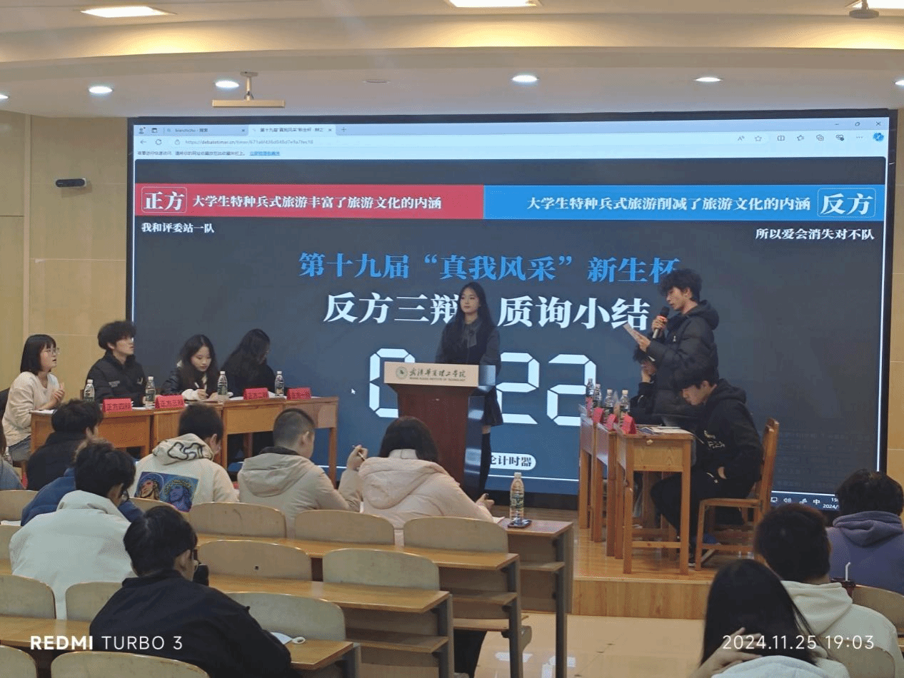第一场就“当代年轻人应选择大城床还是小城房”进行辩论。正方认为大城市提供更多职业机会和资源,尽管生活成本高,但能促进个人成长;反方则认为小城市生活成本低,居住空间更大,能提供更好的生活质量与心理平衡。双方都提出了有力的论据,展现了当代年轻人对于生活方式的多样理解。这场辩论不仅是一次思想的碰撞,也是对当代社会现象的一次深刻反思。第二场就“大学生特种兵式旅游是否丰富了旅游文化的内涵”进行探讨。正方认为,这种旅游方式确实丰富了旅游文化,它鼓励了年轻人以更加积极、探索的精神去体验和了解不同的地方和文化,促进了旅游业的创新和发展,为传统的旅游模式带来了新的活力。反方则提出,特种兵式旅游往往注重速度和效率,可能忽略了旅游的深度体验和文化理解,这种旅游方式可能会削弱旅游文化的内涵。经过双方激烈的辩论,大学生特种兵式旅游既有其积极的一面,也有需要反思的地方。这场辩论不仅让我们对旅游文化有了更深的理解,也启发我们在追求新奇和效率的同时,不应忘记旅行的本质和意义。