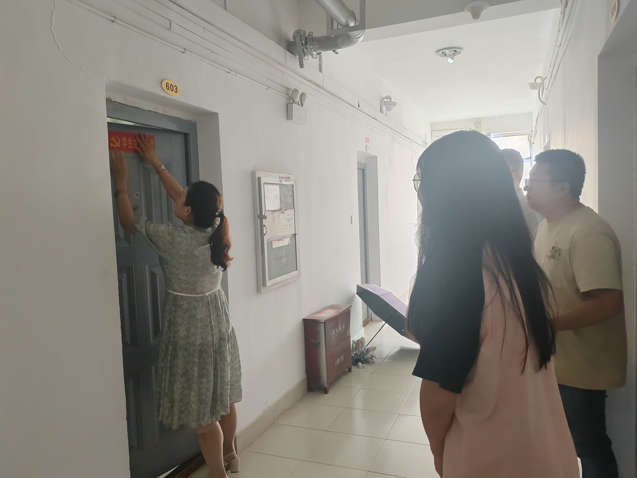 为充分发挥学生党员的先锋模范作用,推动校园文明建设,5月6日,我院组织开展“党员示范寝室”挂牌活动,对全院符合条件的学生党员所在寝室进行统一标识,以党员带头促学风、树新风,营造整洁、和谐、向上的寝室文化氛围,学院党总支副书记张平、学工办主任张琦、组织员吴乐和辅导员陈远扬、万王旋共同参与。