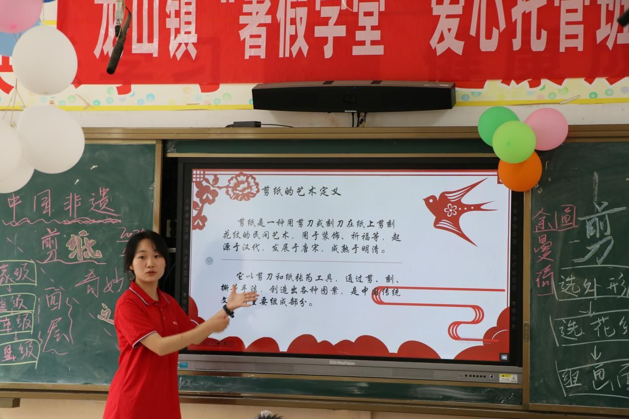 在最令人期待的动手环节,老师在台前演示折纸、画样、裁剪的步骤,从简单的对称折法到基础的纹路剪制,每一步都讲解得细致入微。孩子们领取红纸和安全剪刀后,在老师们的指导下,小心翼翼地折叠、裁剪。红纸在指尖翻飞,逐渐显露出稚嫩却真诚的轮廓。当一张张带着童趣的剪纸作品完成时,孩子们举着自己的“成果”欢呼,红色的纸花映着笑脸,成为这个夏日最动人的风景。 此次剪纸课程不仅让乡村孩子们近距离接触了非遗文化,更在动手实践中培养了审美与创造力。希望未来将继续挖掘传统非遗资源,让更多乡土少年在文化传承中收获成长与快乐。