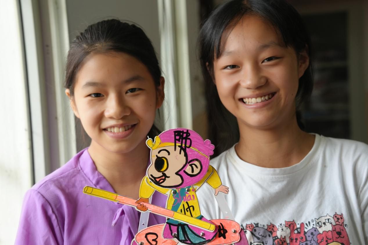 最让人期待的动手环节中,老师先演示组装技巧:“把躯干和四肢的小孔对齐,用毛根穿起来,这样手臂才能灵活摆动!”孩子们领取组件、颜料和调色盘后,立刻投入创作。有的小朋友专注地为孙悟空的金箍棒涂上亮眼的金色,有的则精心调配色彩,想让白骨精的服饰显得更加阴森诡异。组装时,大家互相帮忙穿通关节,有人发现“武将”的手臂总掉下来,便举着作品请教老师,引来周围同学一起研究解决办法。当一个个色彩鲜亮的皮影在手中“活”起来时,孩子们举着作品在阳光下比划,光影投射在墙上,仿佛上演着一场童趣皮影戏。此次课程让乡村孩子在组装与涂色中触摸非遗,既锻炼了动手能力与合作意识,更种下了文化认同的种子。未来,支教团队将继续探索传统技艺的趣味教学,让更多乡土少年在传承中收获成长,让千年皮影艺术在孩子们的巧手中焕发新的光彩。