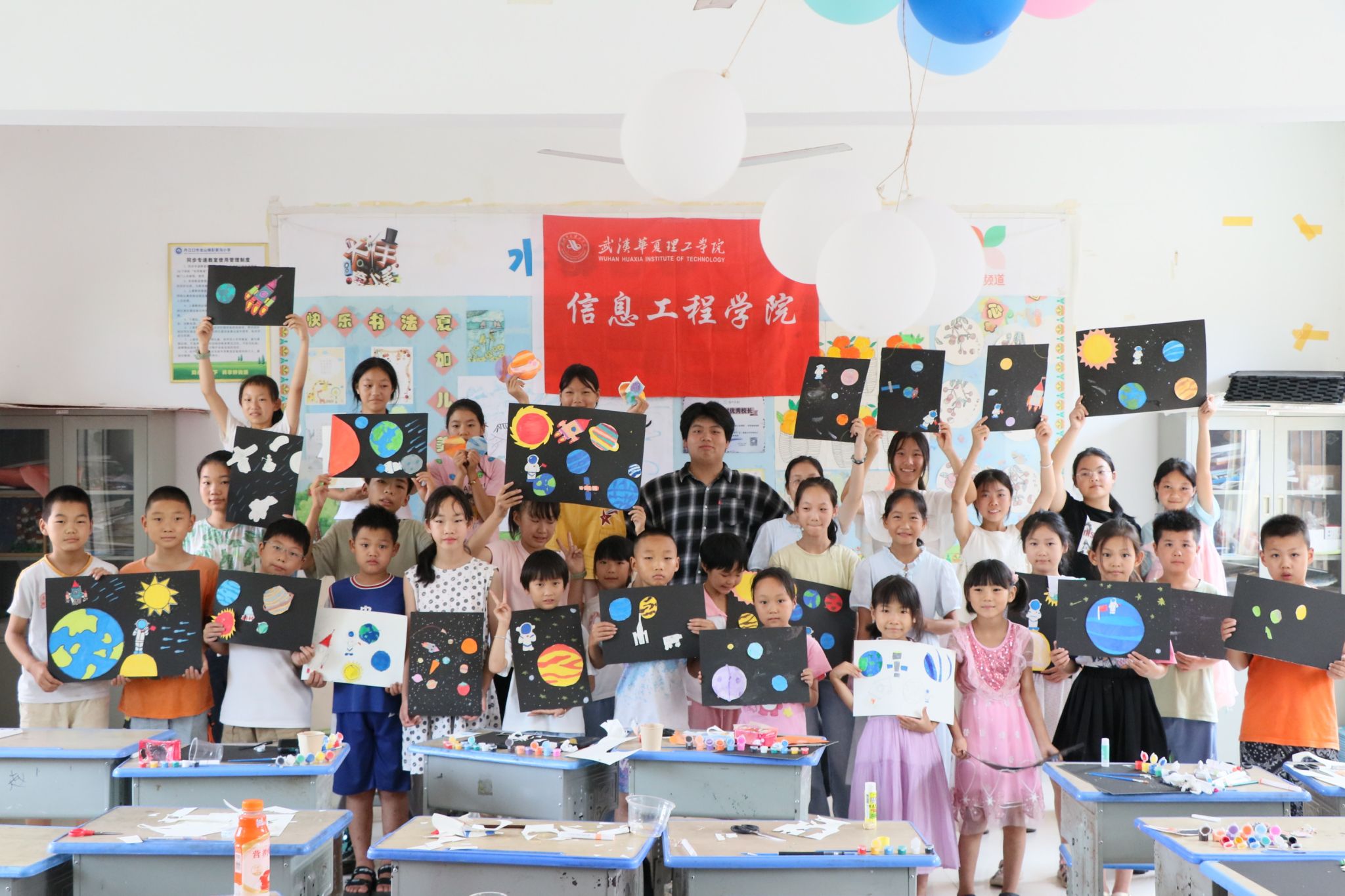 我们带孩子们在纸上贴出电路,看电流如何在导线中奔涌,最终点亮灯泡;教他们用纸板绘制宇宙星球,将孩子们对宇宙的想象绘制出来;当机器人踏着节奏整齐地跳起了舞蹈,孩子们眼中闪烁着对机器人背后代码的好奇。这些课程不追求高深的理论,而是把科技拉到孩子们触手可及的距离:通过鲁米诺实验让平平无奇的水亮起来,在惊呼中记住化学的魔法;就连用简单几块木板拼起来的液压升降台,却能够承受一定的压力,这些小实验,都藏着简单却深刻的科学逻辑。孩子们攥着发烫的电路板问“这根线接错了会怎样”,捧着自制的升降台追着老师验证,这些带着稚气的探索欲,比任何完美的实验结果都更珍贵,它们让科技不再是遥不可及的名词,而成为可以亲手拆解、大胆试错、尽情创造的日常。