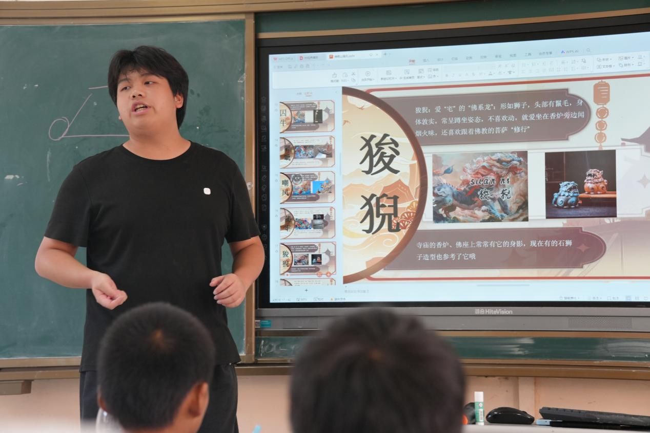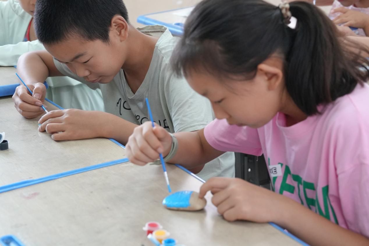 课堂上,志愿者老师以轻松有趣的方式开启艺术启蒙:从横平竖直的线条练习到冷暖色调的碰撞实验,从展示梵高的星空到解析民间年画的对称之美,一步步引导孩子们认识画笔、颜料的 “魔力”。考虑到孩子们的动手能力,课程特意选用马克笔、水彩等易操作的材料,搭配素描纸、石头、树叶等多元载体,让每个孩子都能快速找到创作的乐趣。当老师提出 “画一画你心中的世界” 时,孩子们的想象力瞬间被点燃:有的孩子以非遗为灵感,给皮影人画上草帽、扛起锄头,让传统艺术走进田间地头;有的在石头上涂鸦,给坚硬的石块安上翅膀,变成会飞的 “守护精灵”;还有的将山海经里的神兽与乡村风景结合,让麒麟踏过稻田、凤凰停在晒谷场,画面里满是童真与浪漫。
