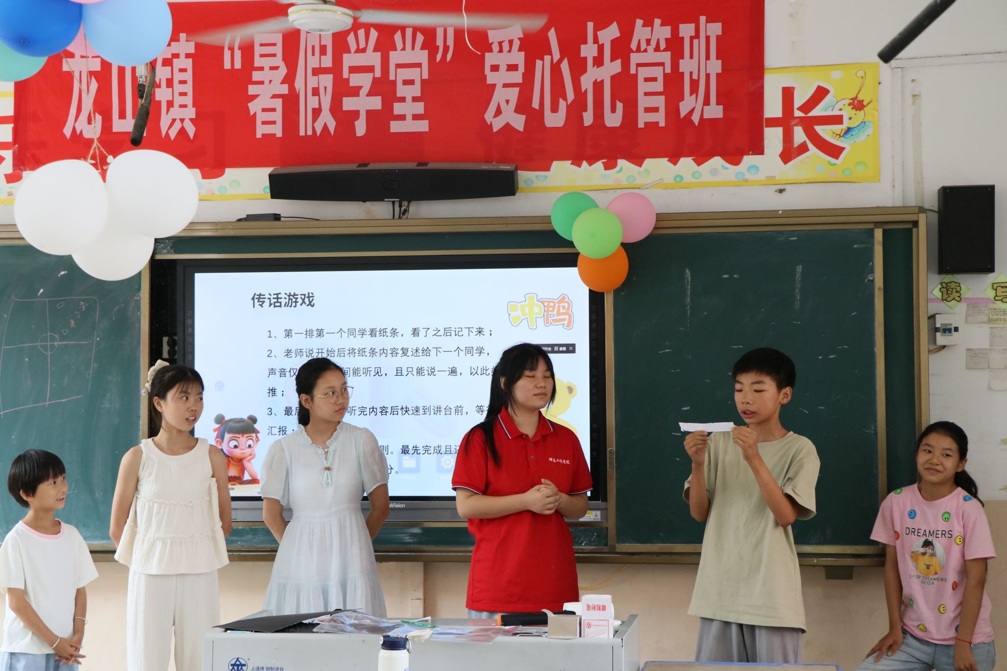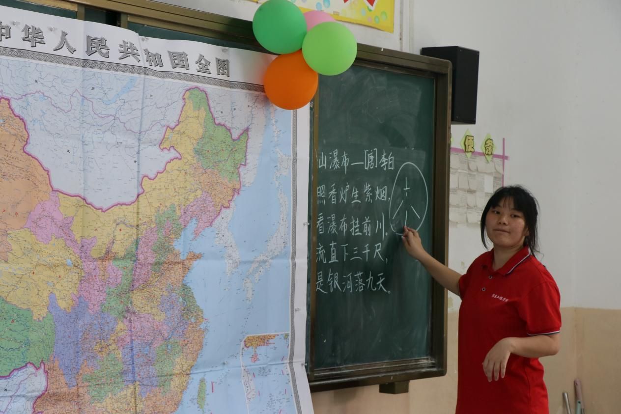 操场上,活力与欢笑交织成最动人的乐章。健美操课上,孩子们跟着支教老师的口令伸展、跳跃,灵动的身影在阳光下跃动,每一个动作都透着蓬勃朝气;体育课上,“两人三足”“接力运球” 等趣味项目让孩子们在奔跑中学会协作,加油声、欢呼声此起彼伏,汗水里折射出团结与拼搏的光芒。运动不仅强健了体魄,更让孩子们在释放活力的过程中收获了纯粹的快乐。课堂里,文化与互动碰撞出奇妙的火花。“诗词里的中国” 课堂上,支教老师用故事串联 “床前明月光” 的乡愁,用影像展现 “飞流直下三千尺” 的壮阔,孩子们在吟诵中触摸传统文化的温度;“声息相传” 游戏中,成语通过肢体动作接力传递,时而因偏差引发哄堂大笑,时而因默契收获欢呼,轻松的互动里藏着沟通与协作的密码。