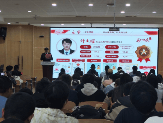 为充分发挥优秀学子的榜样示范作用,营造勤学笃行、锐意进取的优良学风,激励广大学子明确目标、奋发向上,11月5日晚,信息工程学院于2-201报告厅隆重举行了“榜样力量,青春领航”优秀学子报告会。学院党总支组织员吴乐、团总支书记杨陶硕、学生一支部书记李勇、22级辅导员李玲博及各年级学生代表共同参加了此次活动。