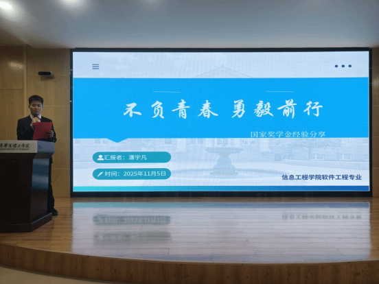 报告会在温馨而庄重的氛围中拉开帷幕,四位在学业、竞赛、学生工作与社会实践等领域表现突出,并荣获国家奖学金的优秀学子依次登台,分享了他们独特的成长经历与奋斗感悟。电信1221班彭琬渟详细讲述了如何有效平衡繁重的学业、参与多项高水平竞赛以及承担学生工作的宝贵经验;信息与电子设计协会副会长许文耀以生动的实例,分享了如何将理论知识应用于实践,将创新构想转化为现实成果的历程;计算机1234班田锐毫无保留地揭秘了自己的高效学习方法和时间管理秘诀,为同学们提供了极具操作性的学习策略;院党员服务站副站长潘宇凡用行动彰显了新时代青年“有理想、敢担当、能吃苦、肯奋斗”的宝贵品质,其将个人成长与服务社会紧密结合的心路历程深深打动了在场师生。