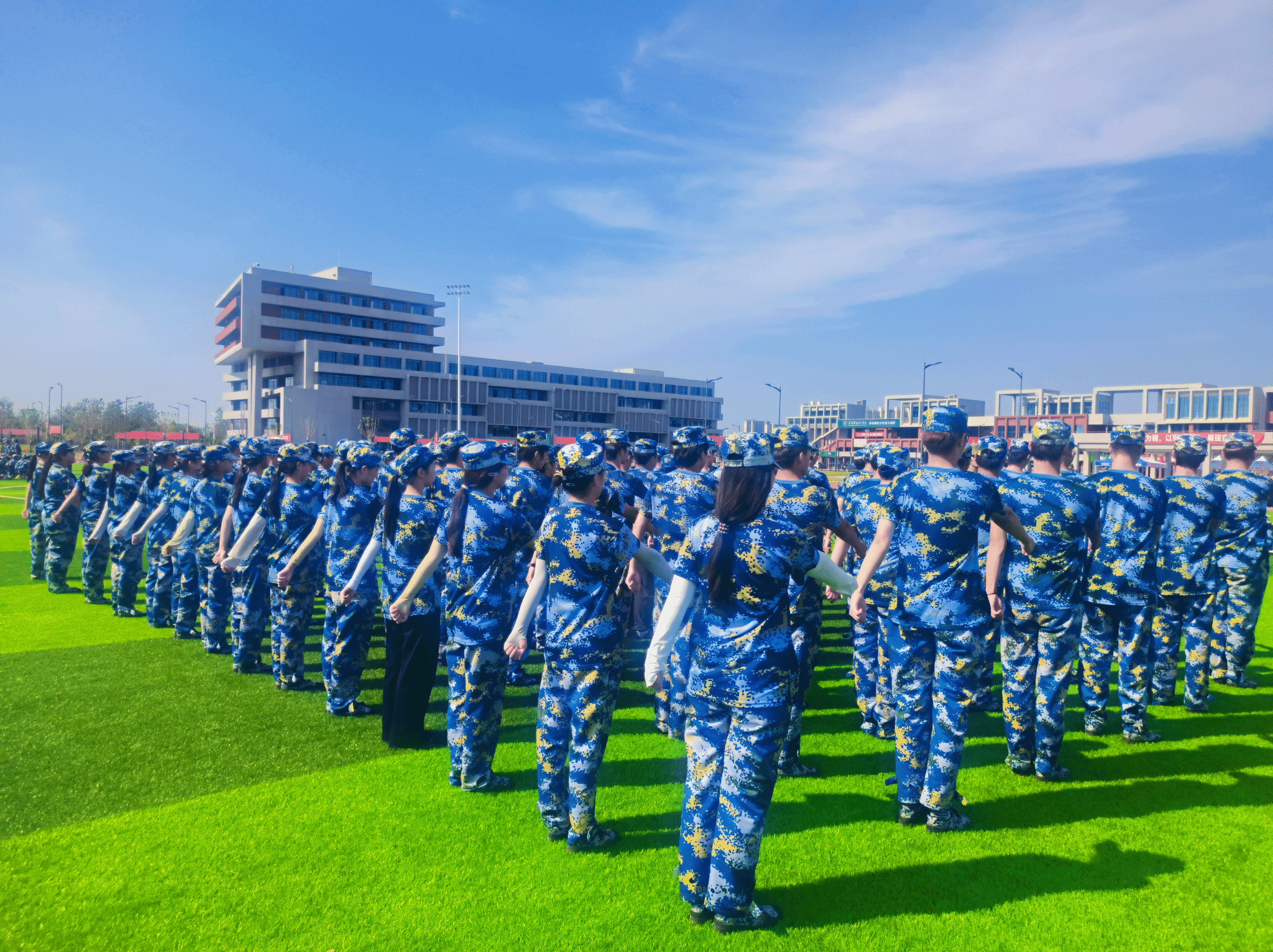 教官穿梭在队伍中,时而纠正摆臂的高度,时而调整步幅的大小。"注意排面!保持间距!"的提醒声不绝于耳。在教官的悉心指导下,同学们的动作越来越标准,排面越来越整齐。最让人感动的是,当有同学动作不到位时,相邻的同学都会主动帮忙纠正,展现出浓浓的战友情怀。