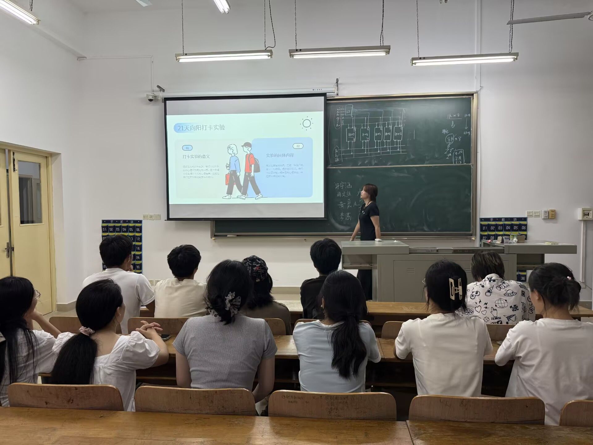 活动围绕“常见心理问题应对”展开,通过案例分析讲解焦虑、情绪低落等问题的诱因,重点分享两大实用缓解方法:一是“五分钟正念呼吸训练”无需复杂准备,学生可随时开展:只需闭眼静坐,将注意力集中在呼吸上,过程中若杂念干扰,轻轻将注意力拉回呼吸即可,每天坚持练习5分钟,帮助平复情绪、缓解焦虑。二是“21天向阳打卡实验”则要求参与者每日完成正念呼吸训练后,在专属打卡群上传训练记录并分享简短感受。