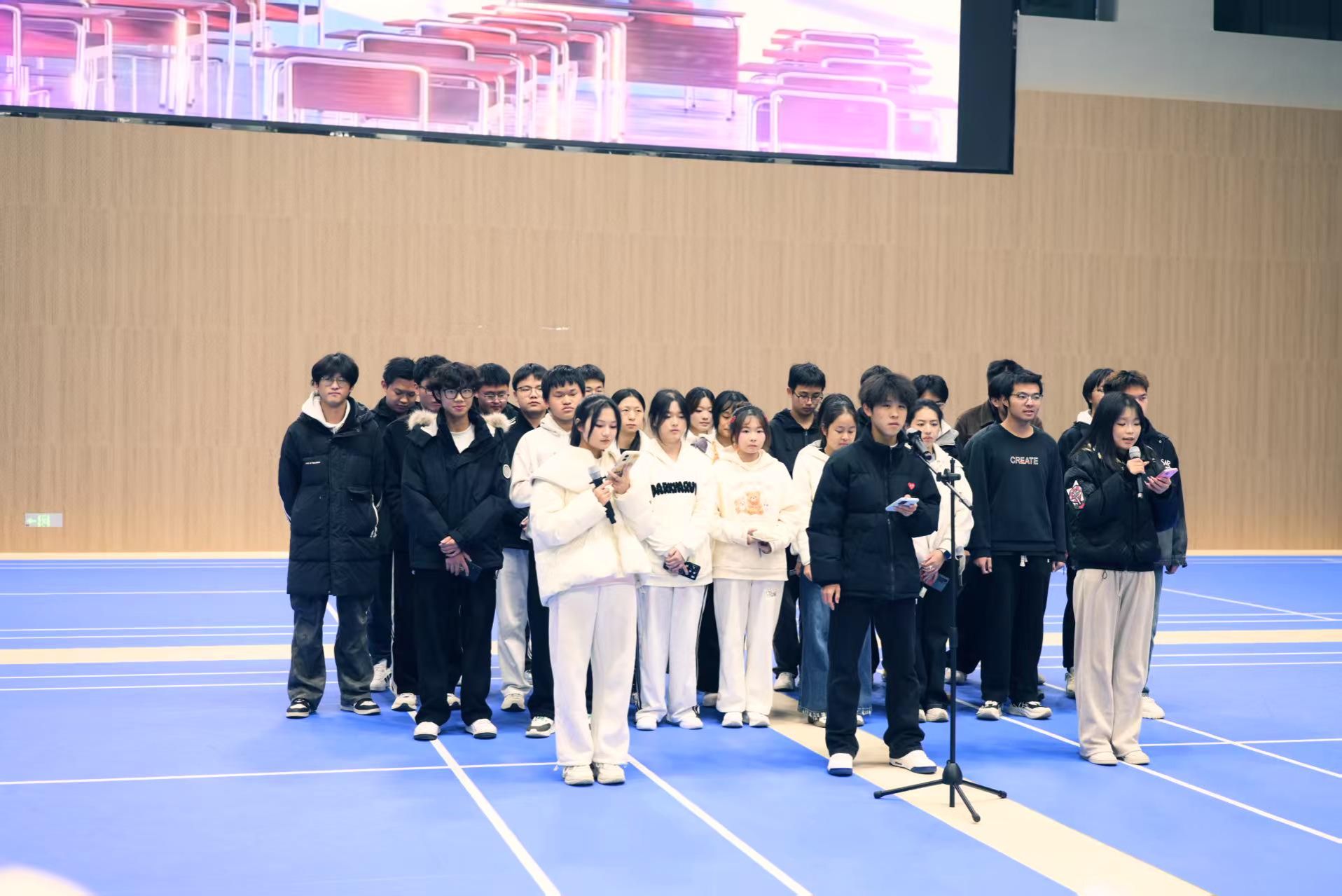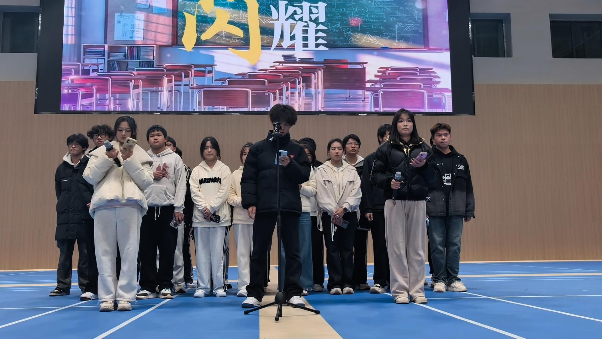 比赛当天,电信1252班集体献唱了汪苏泷的励志歌曲《闪耀》。这首歌曲旋律激昂、歌词充满力量,表达了追逐梦想、勇敢前行的青春态度,与同学们的心声产生强烈共鸣。演出过程中,同学们精神饱满、队列整齐,歌声嘹亮而富有情感。在指挥同学的带领下,高低声部配合默契,情感层层递进,配合简洁有力的手势动作和精心设计的舞台走位,将歌曲中“不惧风雨、勇敢发光”的主题淋漓尽致地展现出来。当“我无比庆幸此刻年少,青春正燃烧”这句歌词响起时,全场气氛达到高潮,同学们用歌声传递出对梦想的执着与对集体的热爱,赢得了现场评委和观众的热烈掌声。
