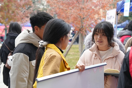 实践队的专属展台前人头攒动,两大非遗体验区成为现场“打卡热点”。中草药香包制作体验区里,志愿者们熟练演示药材研磨、按比例调配、棉线封装等步骤,结合现代需求改良传统香方,向参与者介绍不同药材的养生功效。扎染体验区同样热闹非凡,志愿者们提前准备好白布、染料、皮筋等材料,从基础的“田字格”“螺旋纹”捆扎法教起,耐心指导大家创作专属作品,原本素净的白布在一次次晕染中绽放出独一无二的花纹,生动诠释了非遗文化的传承活力。