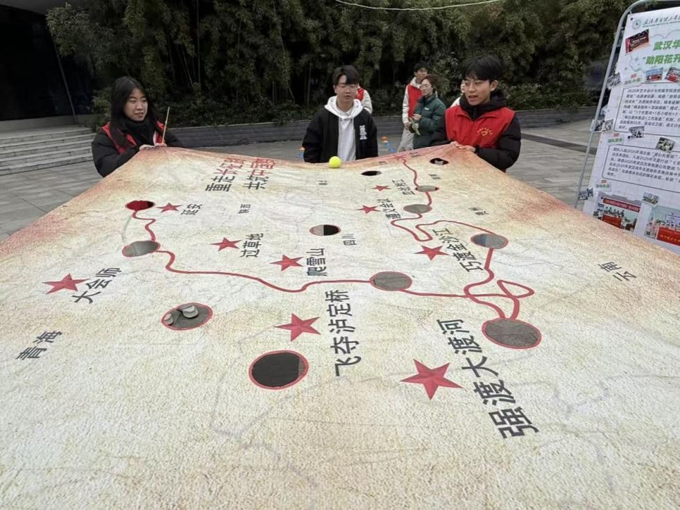 红色文化互动体验区里,实践队设置了“重走长征路”情景板块。志愿者引导参与者通过小球在长征地图上滚动完成长征路线,在趣味互动中重温长征关键节点,感受红色精神的力量。在主题分享环节中,实践队代表回顾了实践队连续两年前往丹江口市龙山镇彭家沟小学的支教经历:不仅开设中草药认知、扎染手工等非遗特色课堂,还利用专业优势开展编程启蒙、机器人体验等课程;针对儿童开展学业辅导、心理疏导,组织“红色故事分享会”“趣味体育课”等活动。作为湖北省“七彩假期”优秀志愿服务团队,沐光实践队的事迹生动展现了高校学子扎根基层、服务社会的责任与担当。