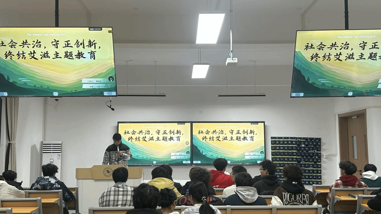 为增强同学们的艾滋病防治意识,倡导健康生活方式,12月3日,人工智能1252在B313教室开展“社会共治,守正创新,终结艾滋”主题团日活动。活动由团支书夏祝贺主讲,全班同学积极参与。