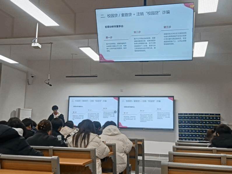 班长首先结合近期高校内发生的真实案例,深入浅出地剖析了“冒充客服退款”、“虚假兼职刷单”、“冒充熟人借钱”等针对大学生群体高发电信网络诈骗的套路与心理陷阱。一组组触目惊心的数据、一段段受害同学的亲身经历分享,让在场同学们深刻认识到诈骗并非远在天边,而是可能潜伏在日常网络生活的每一个角落。
