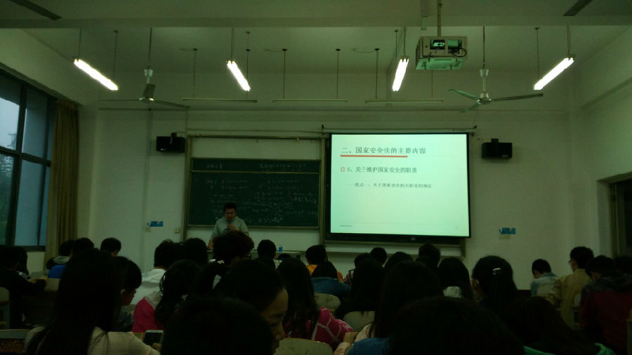 首先,张导和往常一样,对上周整个专业同学们在学习和生活上的进步和值得改进的地方进行点评。紧接着,张导以一句“再来和同学们聊聊身边时事吧”,瞬间引起同学们的兴趣。接下来,张导通过PPT向同学们简单的介绍了我国新出台的《国家安全法》,并提醒同学们做知法、懂法、守法、用法的大学生。然后,他又提到国家面向大学生的征兵政策。还将韩国、台湾的征兵政策与我国的进行对比说明,鼓励有意向的同学积极报名。