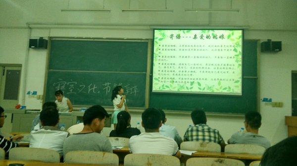 为了促进寝室文化建设,我系首次举办了寝室文化节,第一届寝室文化节答辩于5月12号下午6点在3-201正式举行。到场的嘉宾有团委副书记姚卓夫老师、学工处宿管科科长孙华老师、我系学工办主任胡少梦、党总之秘书程先亮老师、团总支书记向胜涛以及各专业辅导员。