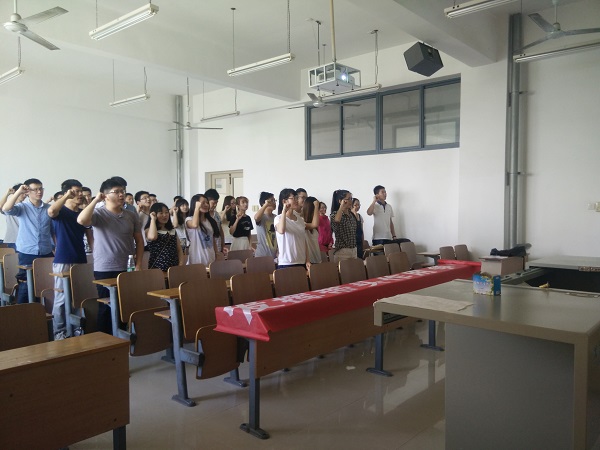 活动伊始,与会党员在写有“发挥党员带头作用,争做模范先锋”的大横幅上签名,学生党员依次排队,将自己的名字公正的写在横幅上。然后,预备党员叶念念同学带我们共同学习了党的理论知识,强调了学生党员应尽的义务,杜绝反党的言辞,恪守党的准则。活动最后,全体党员起立,右手握拳,宣读入党誓词,整个过程庄严肃穆,无一人苟笑,更无一人玩看手机,最后一句“永不叛党”深深的震撼着在场的每一人。