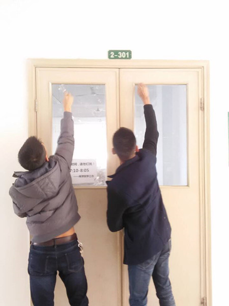 参与此次活动的共有30位同学。全员分为四组,分别由负责人胡小妹、班长潘文杰、组长王子龙和组长金振宇带领。活动中,各小组成员首先对教学楼内牛皮癣进行铲除,同学们拿硬币,或者小刀与牛皮癣展开“搏斗”,最后大致将教学楼内的牛皮癣清理干净。然后组织成员到教室内对门窗、黑板以及黑板槽内粉笔灰进行清理,并且展开对塑料瓶的回收工作。所有工作完成之后大家还不忘将粉笔盒以及黑板擦摆放整齐。其中由组长金振宇带领的小组,前往学术报告厅进行卫生清理工作。经过他们一丝不苟的清洁,报告厅内的环境卫生也有明显的变化。