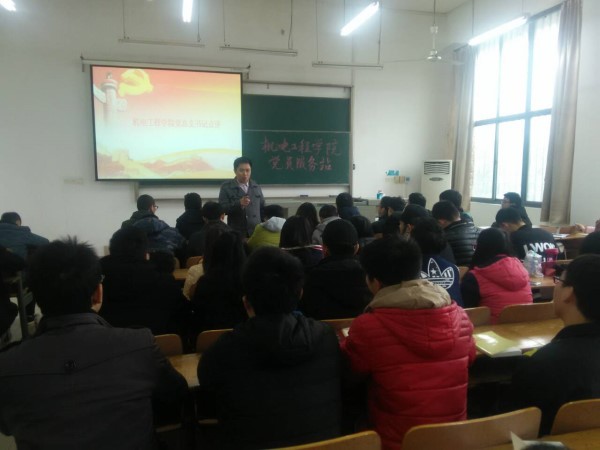 2016年12月13日中午12时10分,机电工程学院党总支书记靳路民于1-102教室讲授党课,其主题为“如何做一名合格党员”。我院党总支秘书汤雁、学工办主任郝志康、学院辅导员老师、全体14级党员及预备党员以及15级发展对象共同参加本次学习。