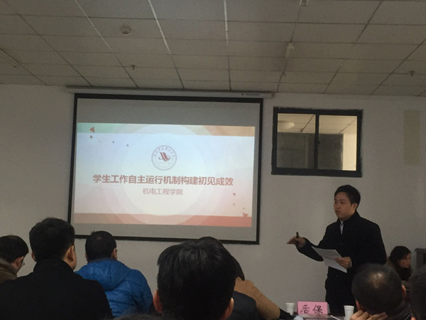 会上,机电工程学院党总支书记靳路民以“学生工作自主运行机制构建初见成效”为主题,作了2016年度学生工作总结汇报。汇报内容包含“一个团队——队伍建设”、“二维创新——创新创业”、“三大建设——公寓建设”、“四全育人——思政教育”、“五优工程——党群工作”、“六个到位——日常管理”、“七项重点——学风建设”、“八大举措——就业工作”等八个板块。靳路民书记就每个板块利用限有的10分钟时间“立言之本意”对我院学生工作特色、工作效果和品牌活动做了分析和阐述。现场气氛热烈,汇报内容令人印象深刻,收获颇多。