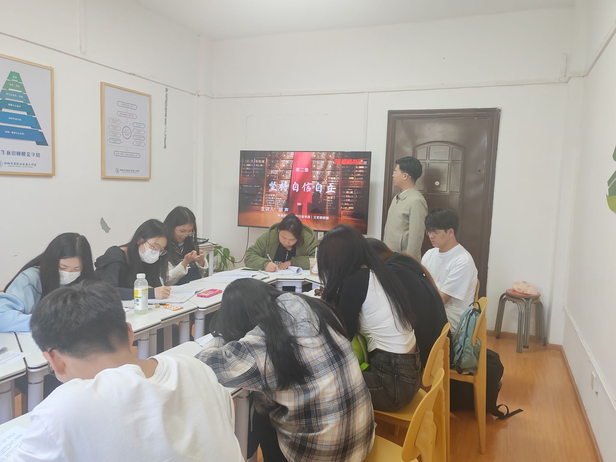 在开场陈远扬老师引用习近平总书记的相关论述,为大家解读了“坚持自信自立”的内涵和时代价值。活动以庄重的氛围开展,来自各专业的同学纷纷加入共同探讨“自信自立”在当代大学生中的深远意义。同学们分享了对“坚持自信自立”的深刻理解和个人体会。有的同学从学业规划、创新创业的角度,有的同学从文化自信、品德修养的层面,各抒己见,形成了丰富多彩的思想碰撞。